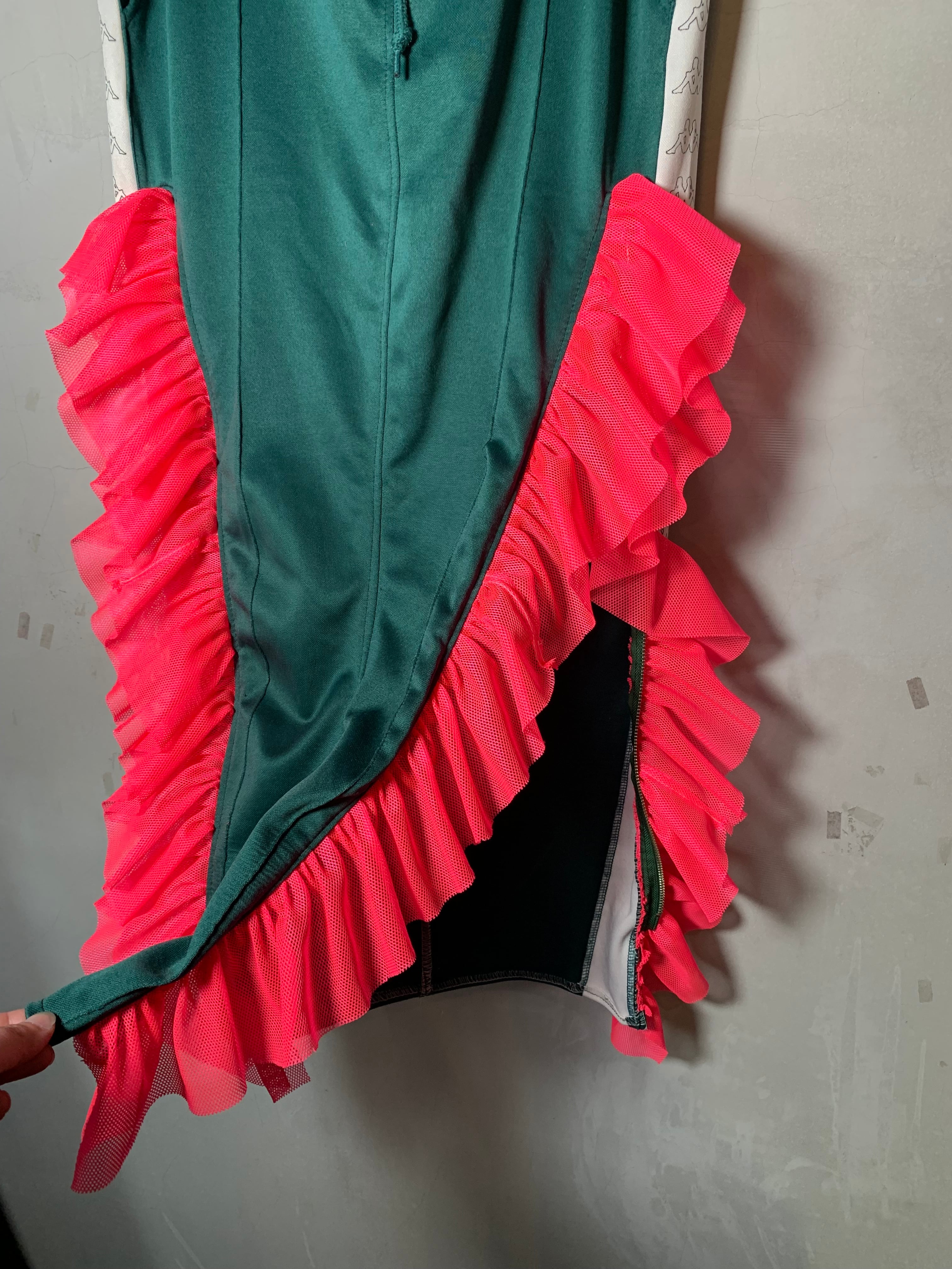両脇にスリットを入れて、メッシュ生地のフリルを付けました。