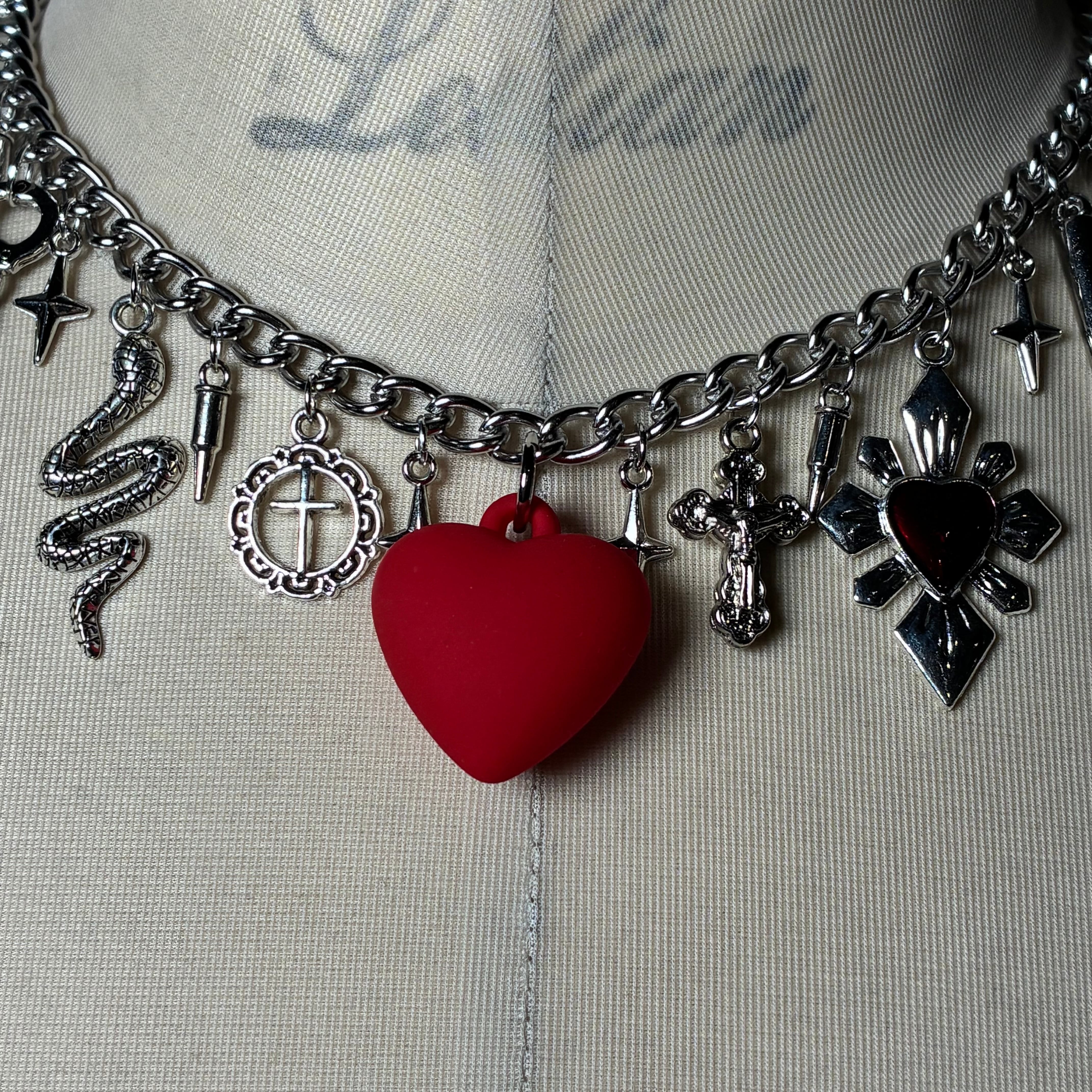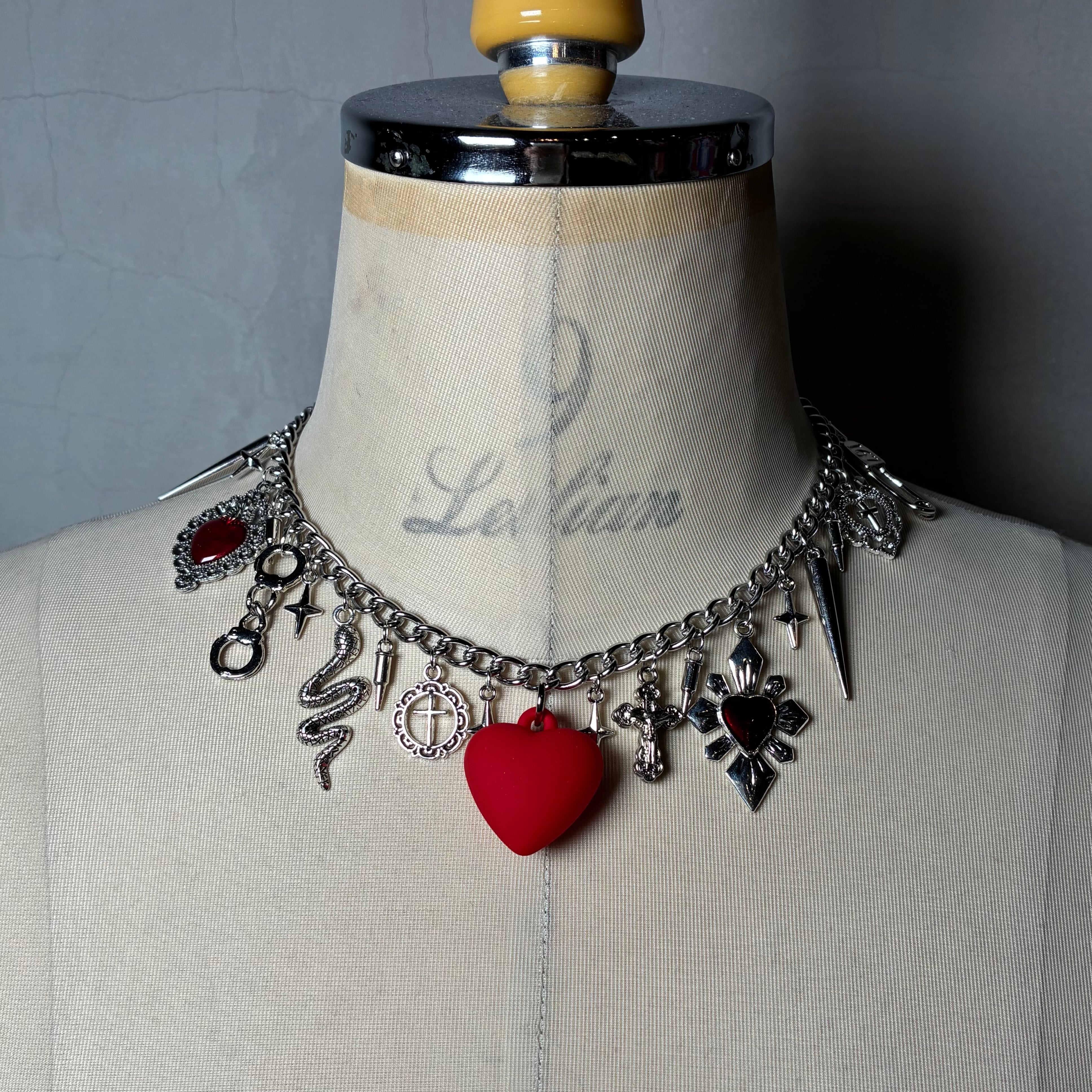 マットな素材の大きいハートチャームを中心に色んなチャームを組み合わせました。