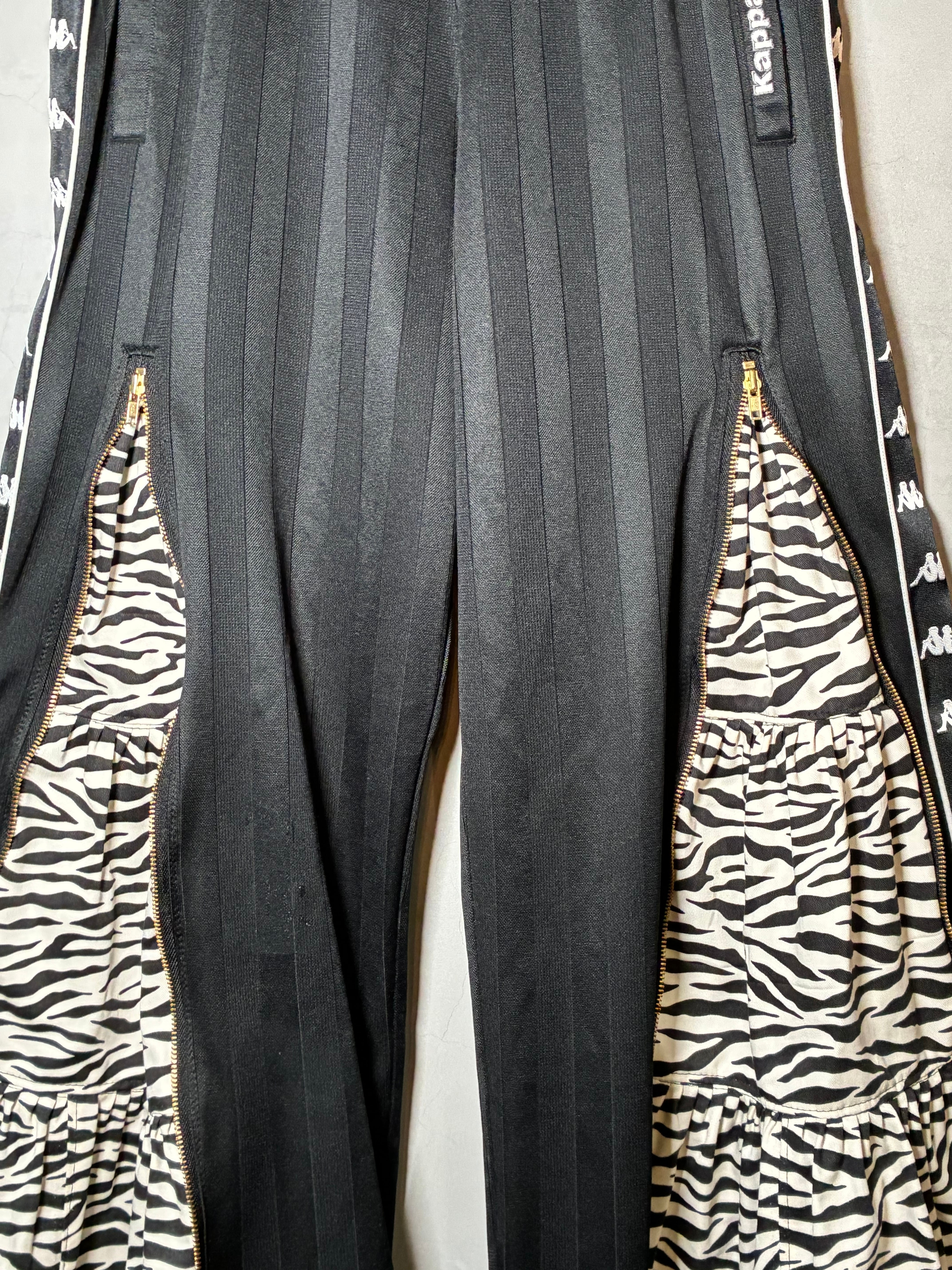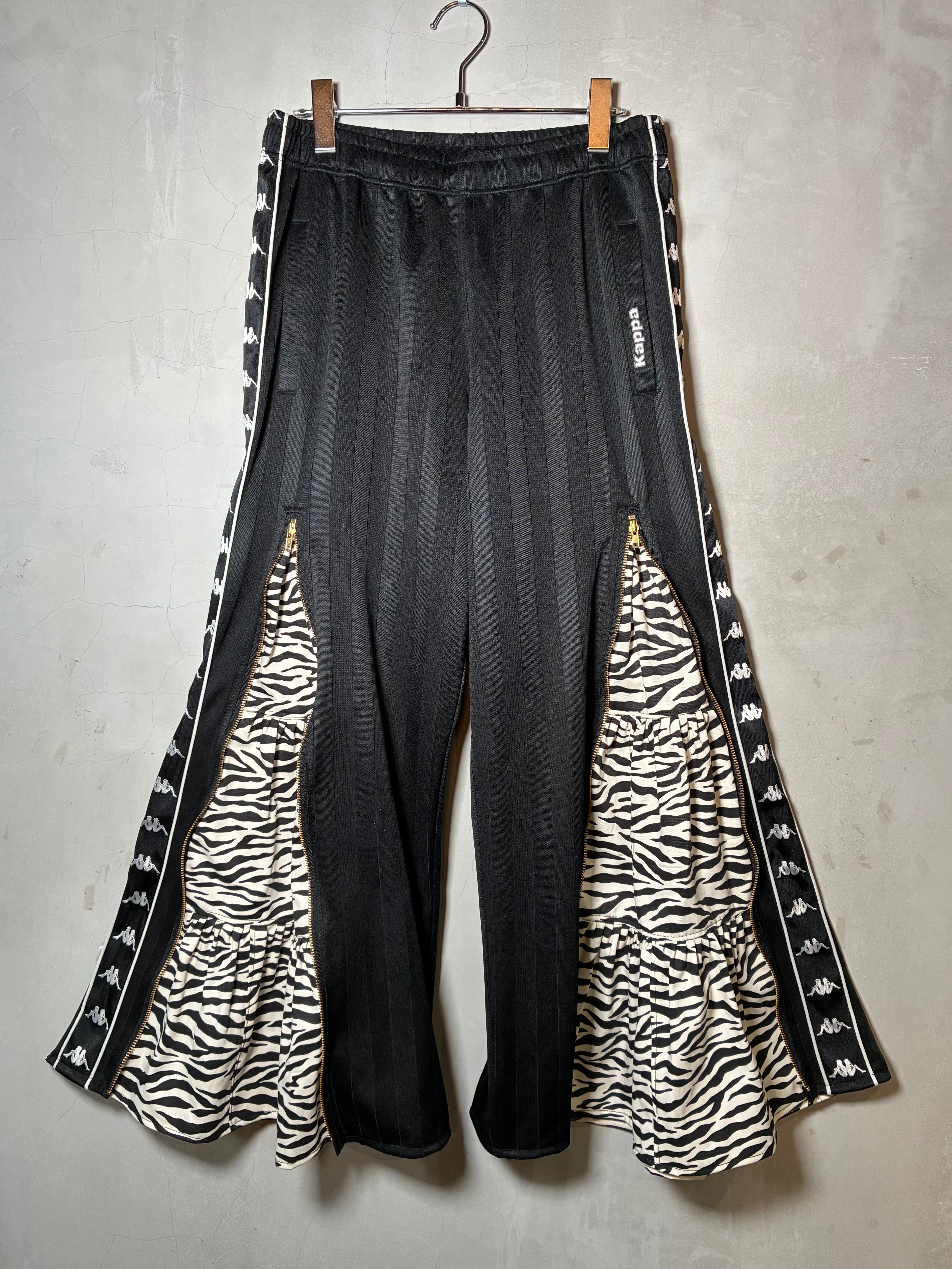 トラックパンツにファスナーをつけて前後の裾が広がるデザインに。