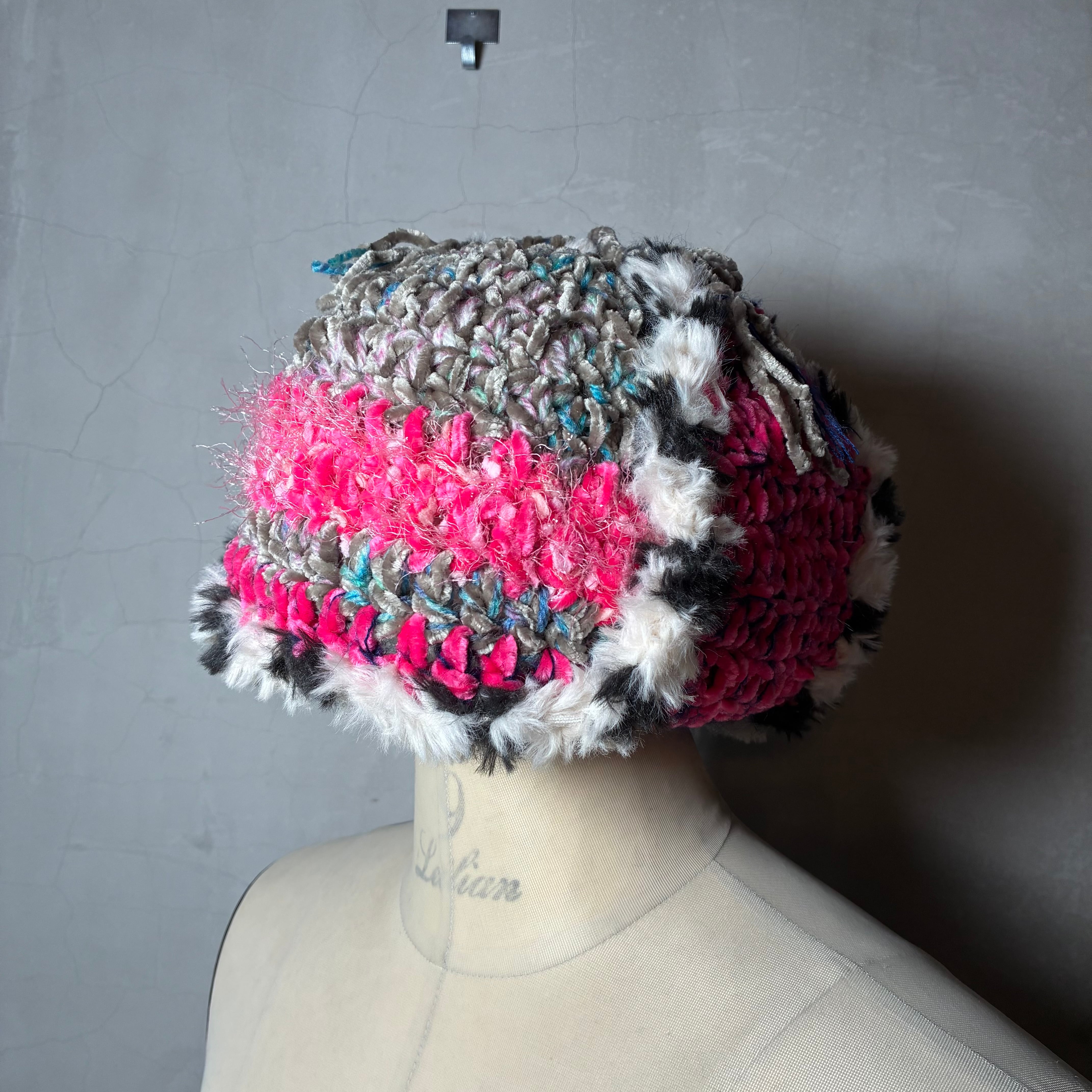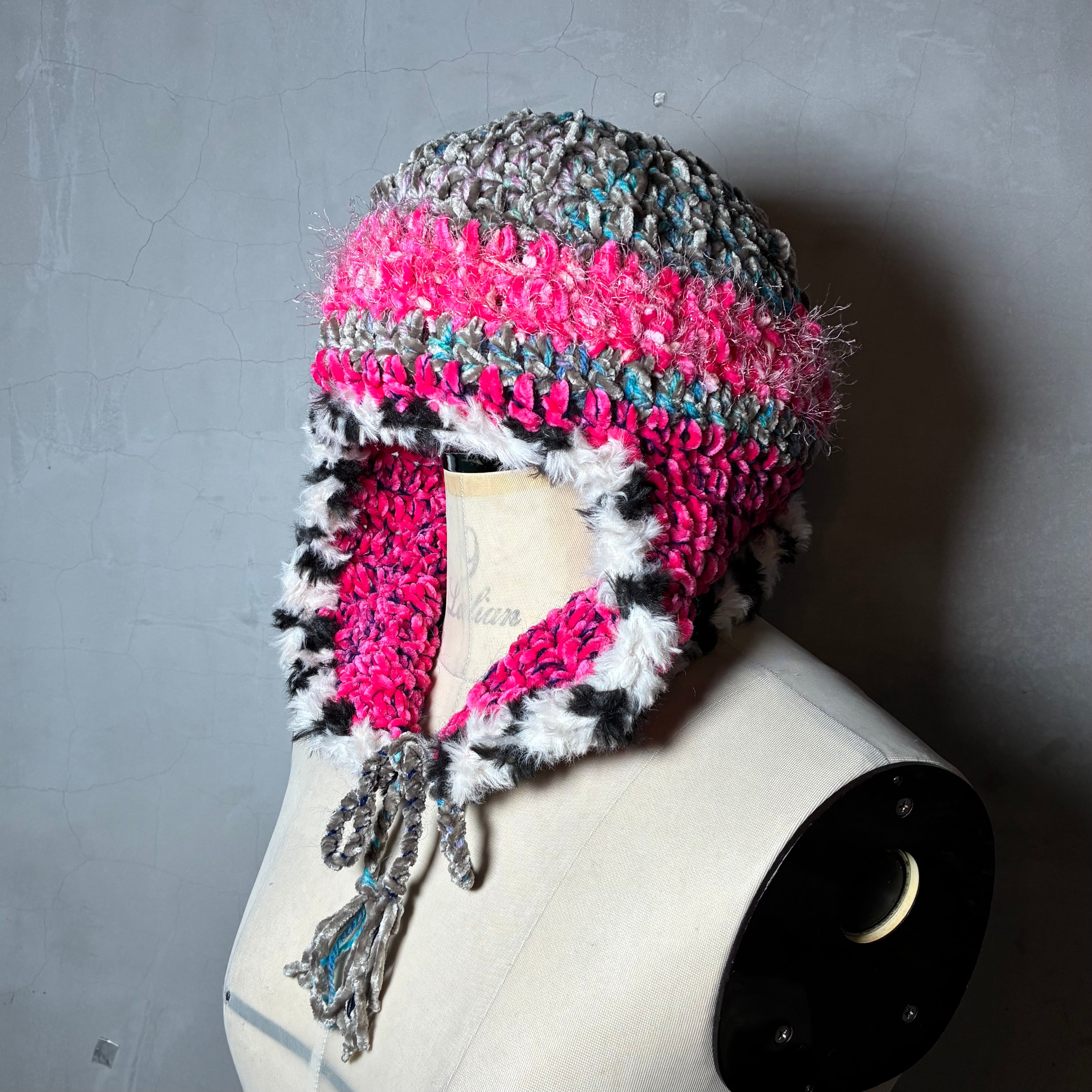 色んな毛糸をMIXして耳当てつきのニットキャップを編みました。