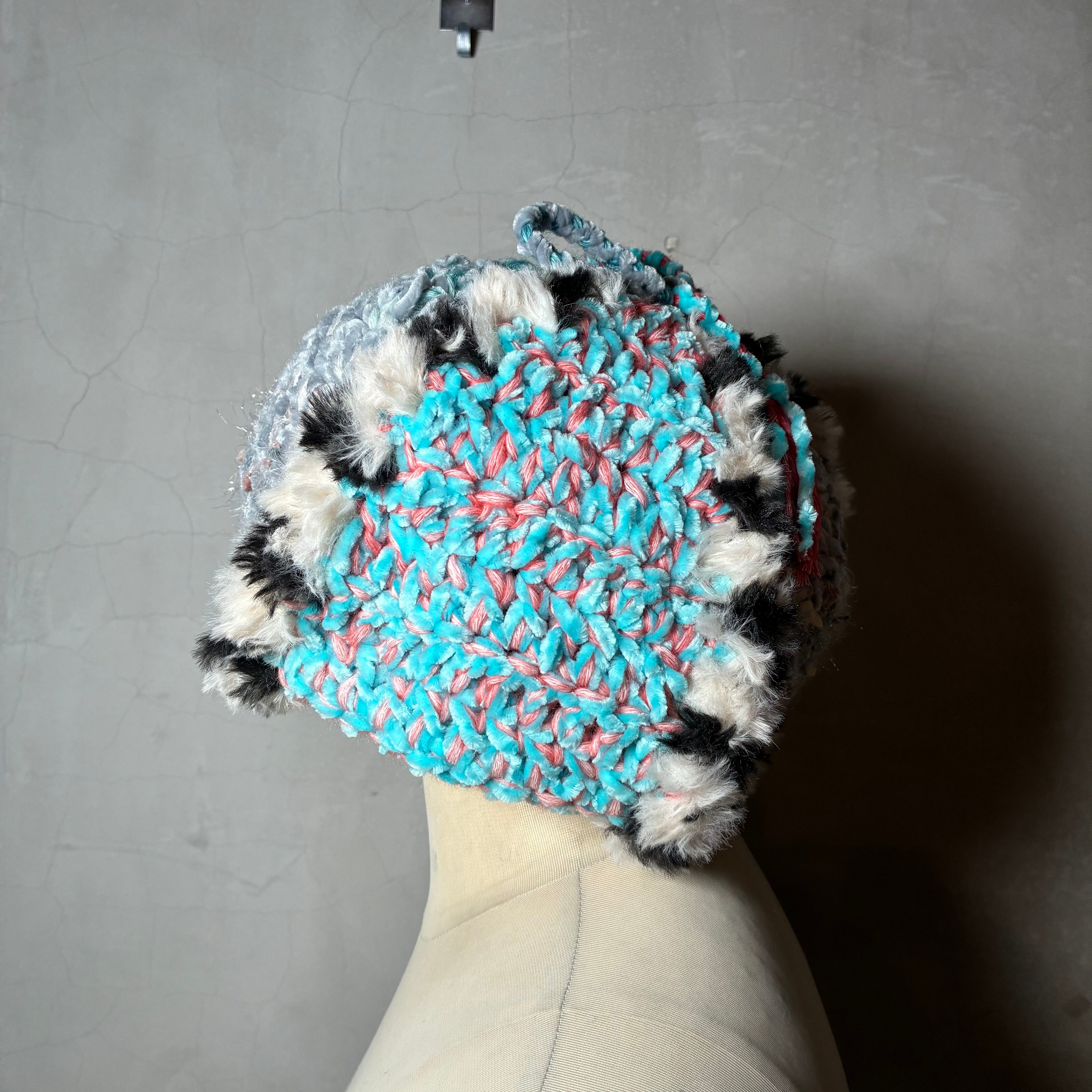 色んな毛糸をMIXして耳当てつきのニットキャップを編みました。