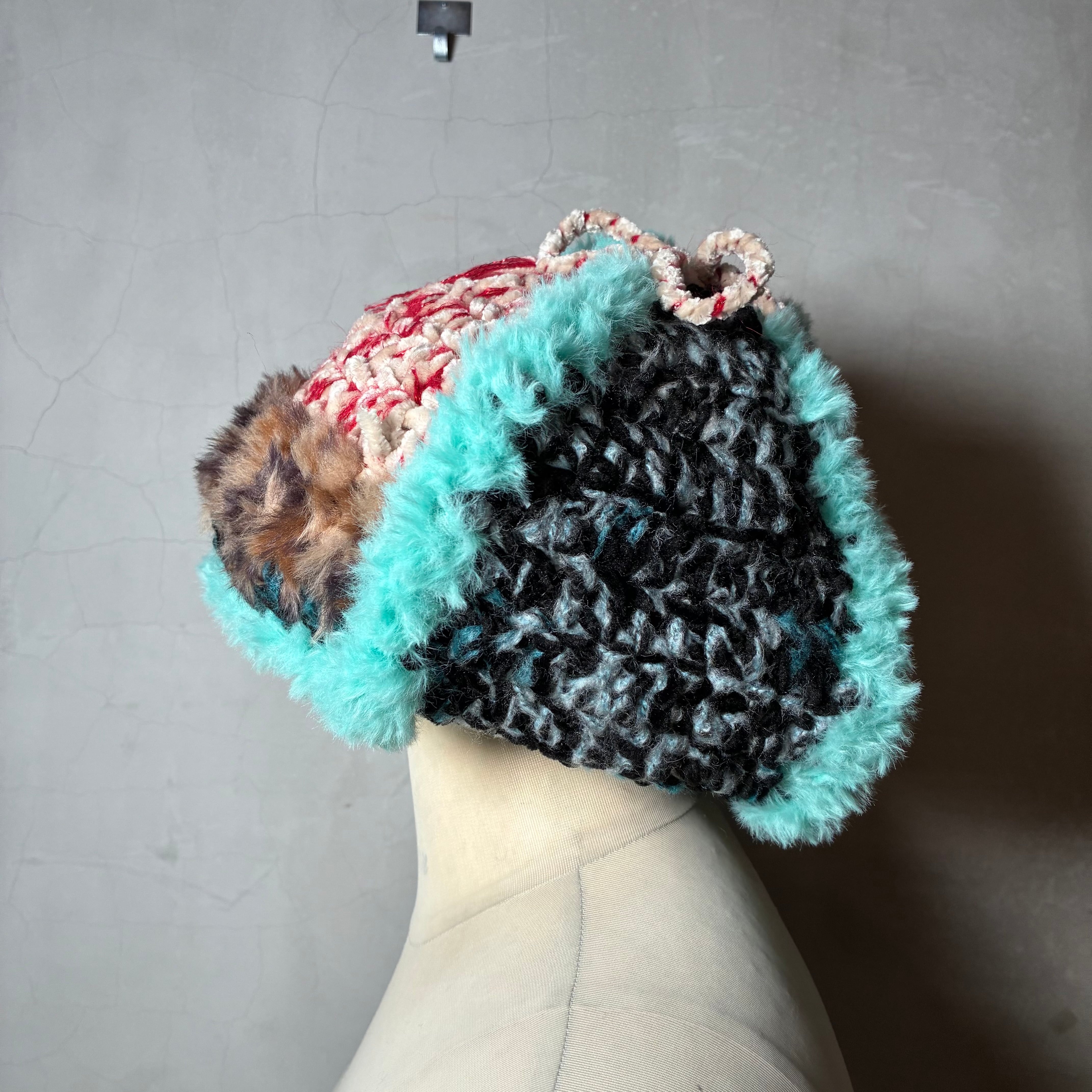 色んな毛糸をMIXして耳当てつきのニットキャップを編みました。