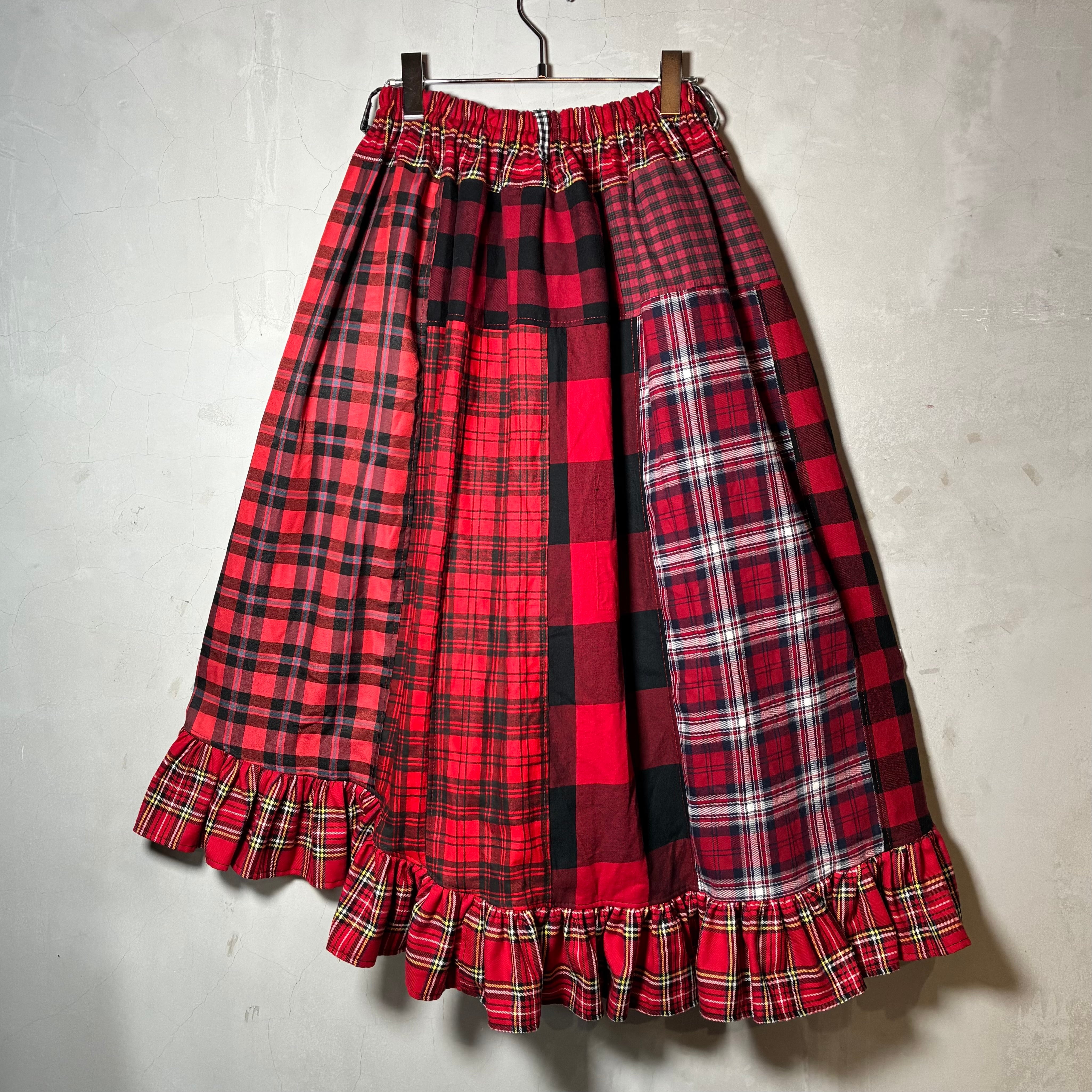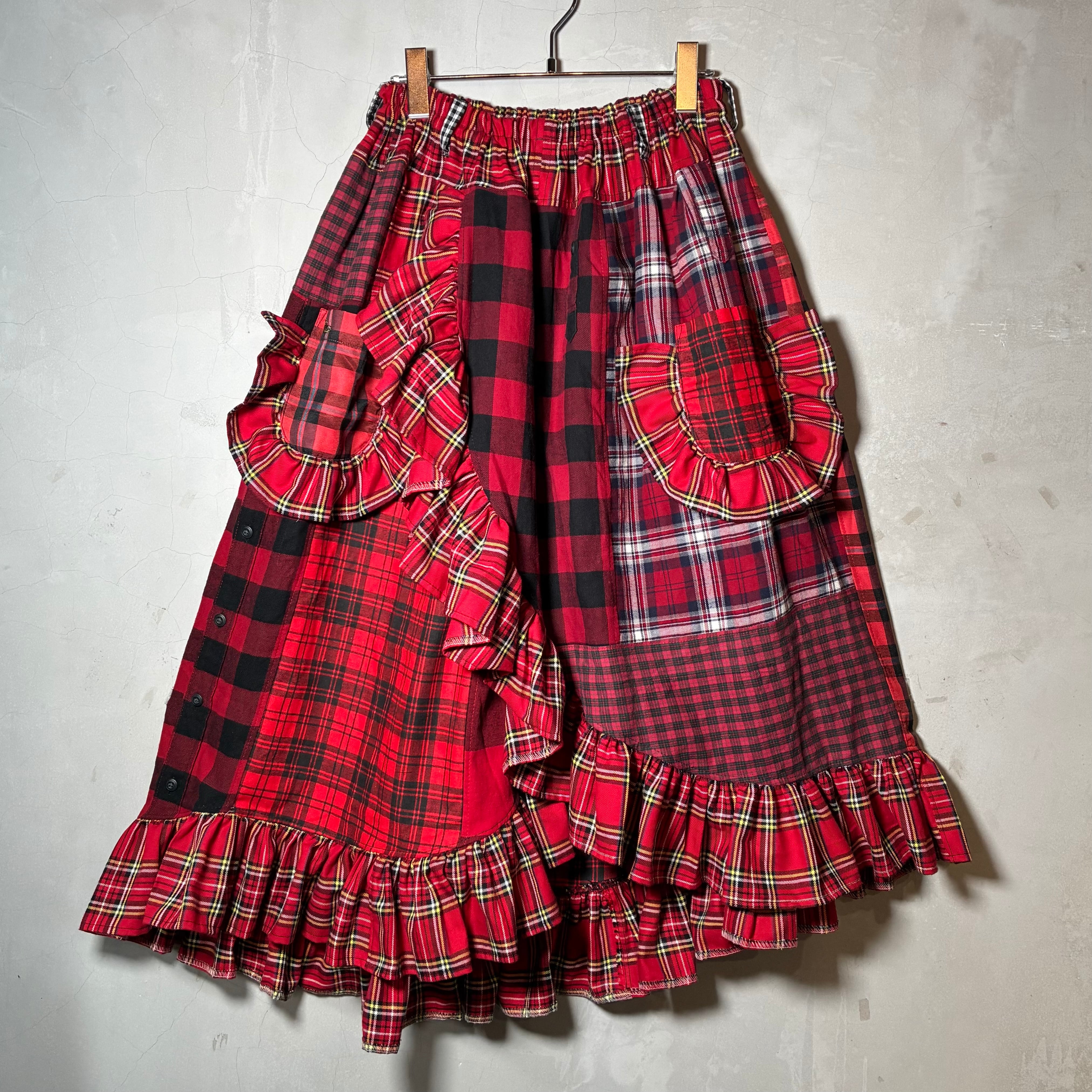 チェックシャツを解体して巻きスカート風のデザインにリメイク。