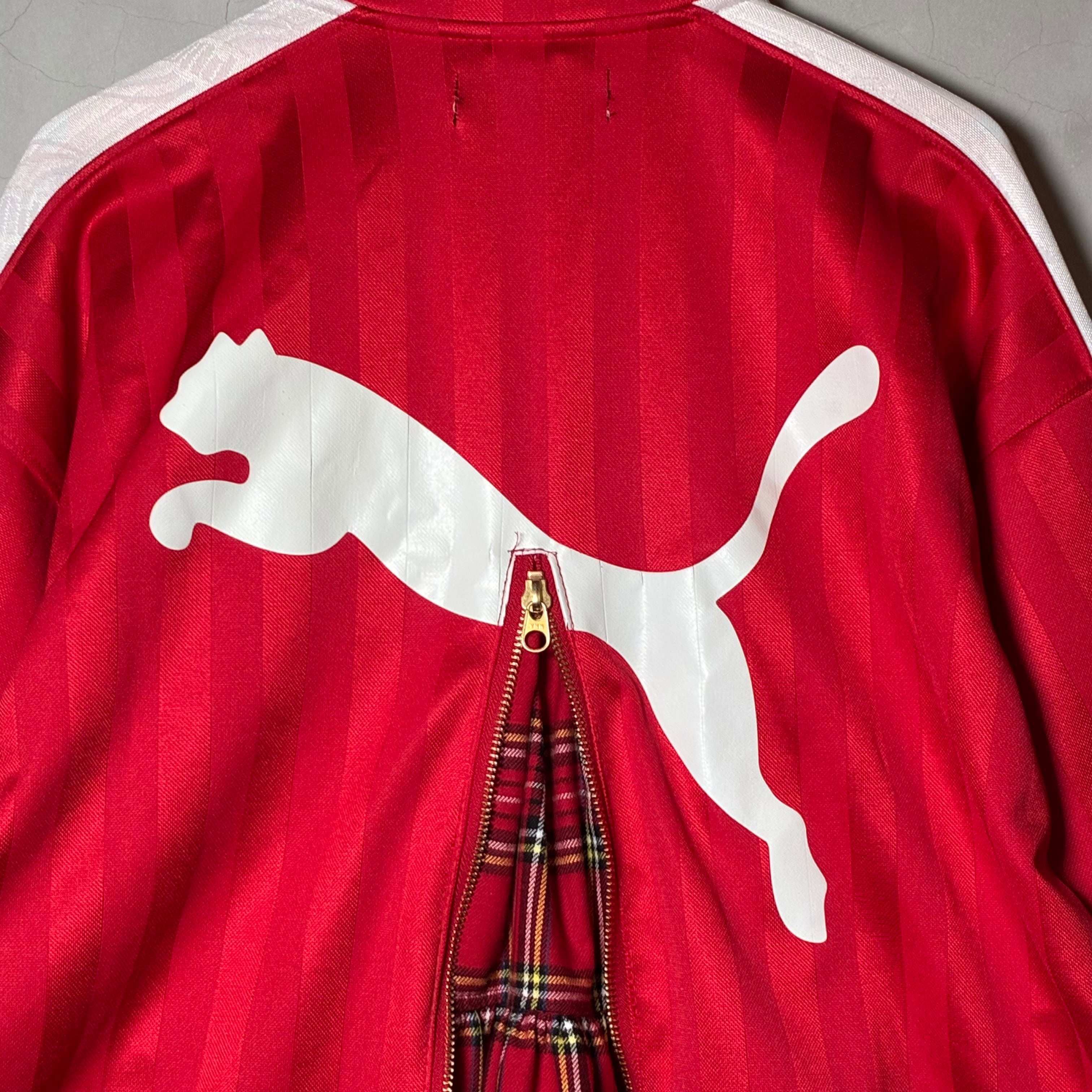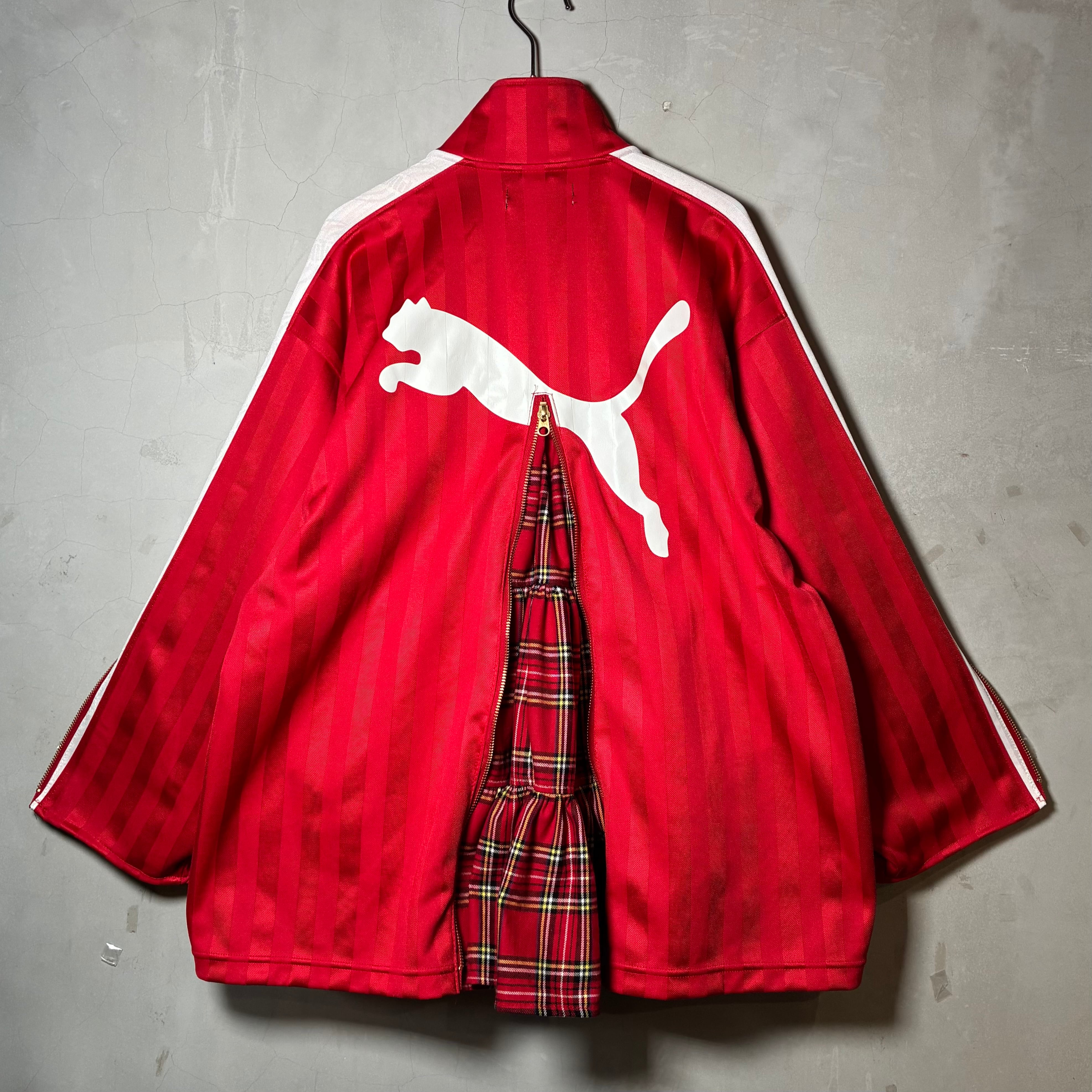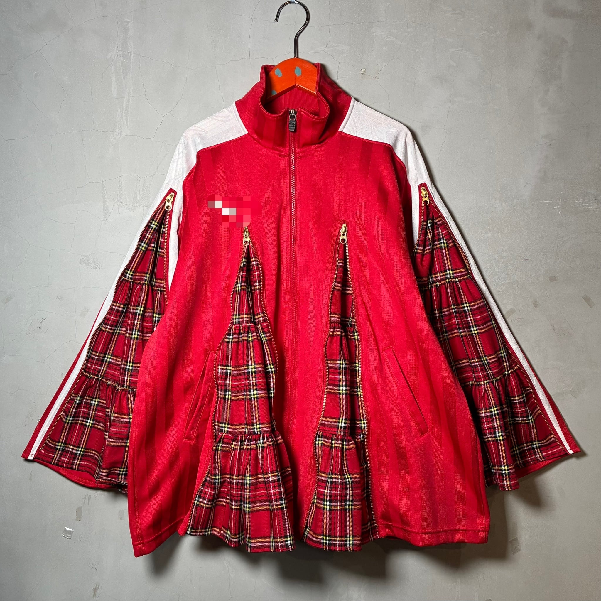 トラックジャケットにファスナーをつけて裾が広がるデザインに。