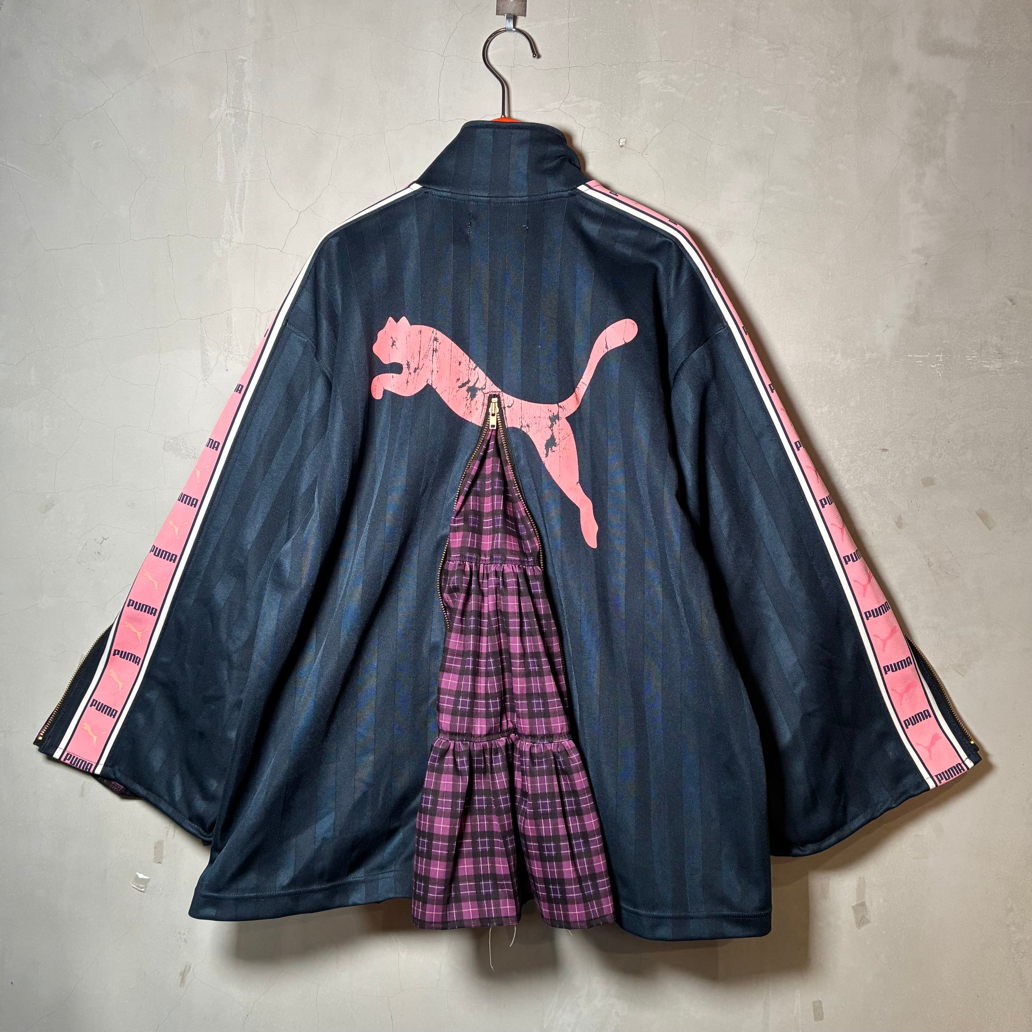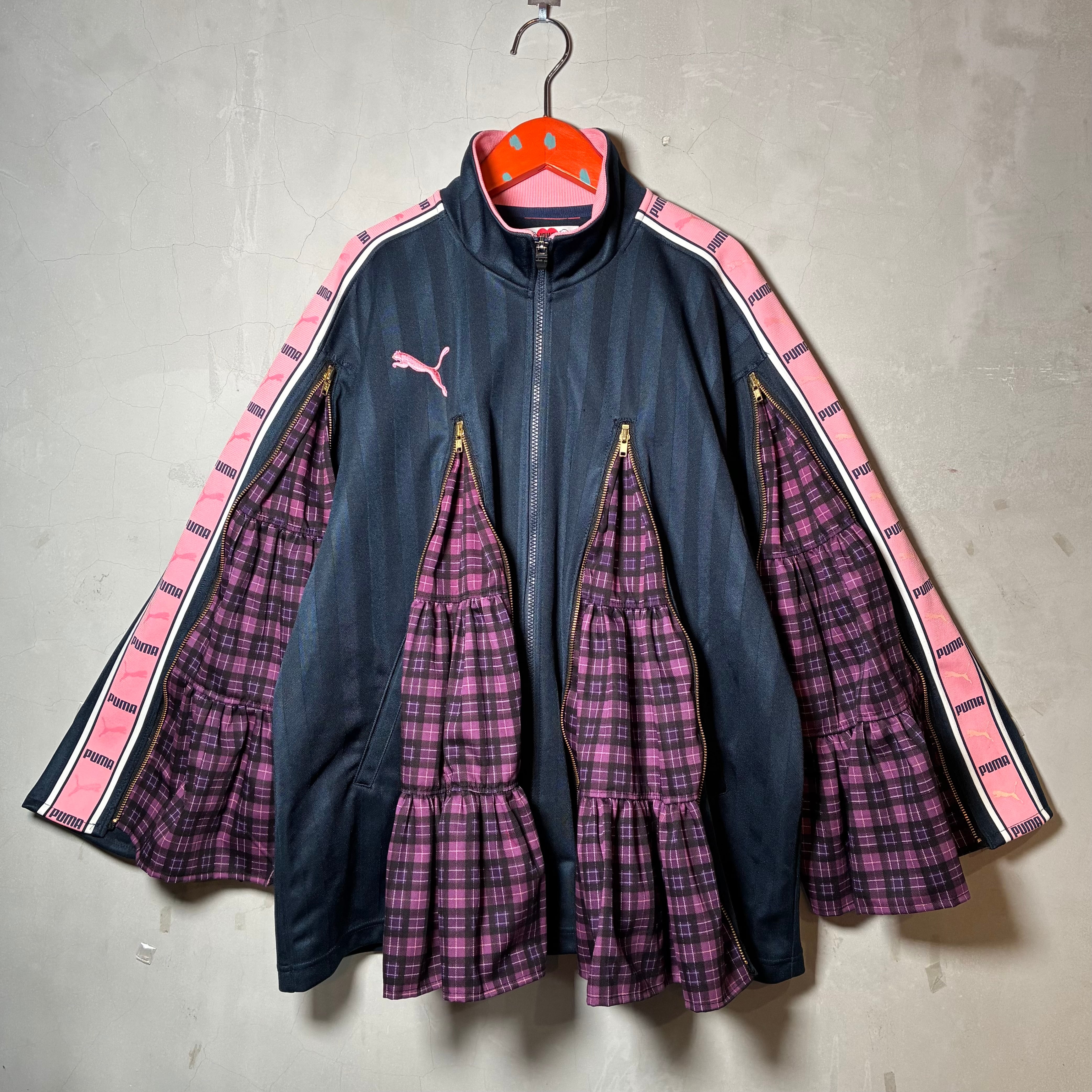 トラックジャケットにファスナーをつけて裾が広がるデザインに。