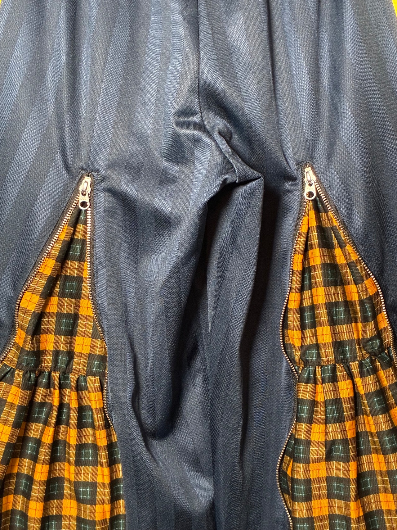 トラックパンツにファスナーをつけて前後の裾が広がるデザインに。