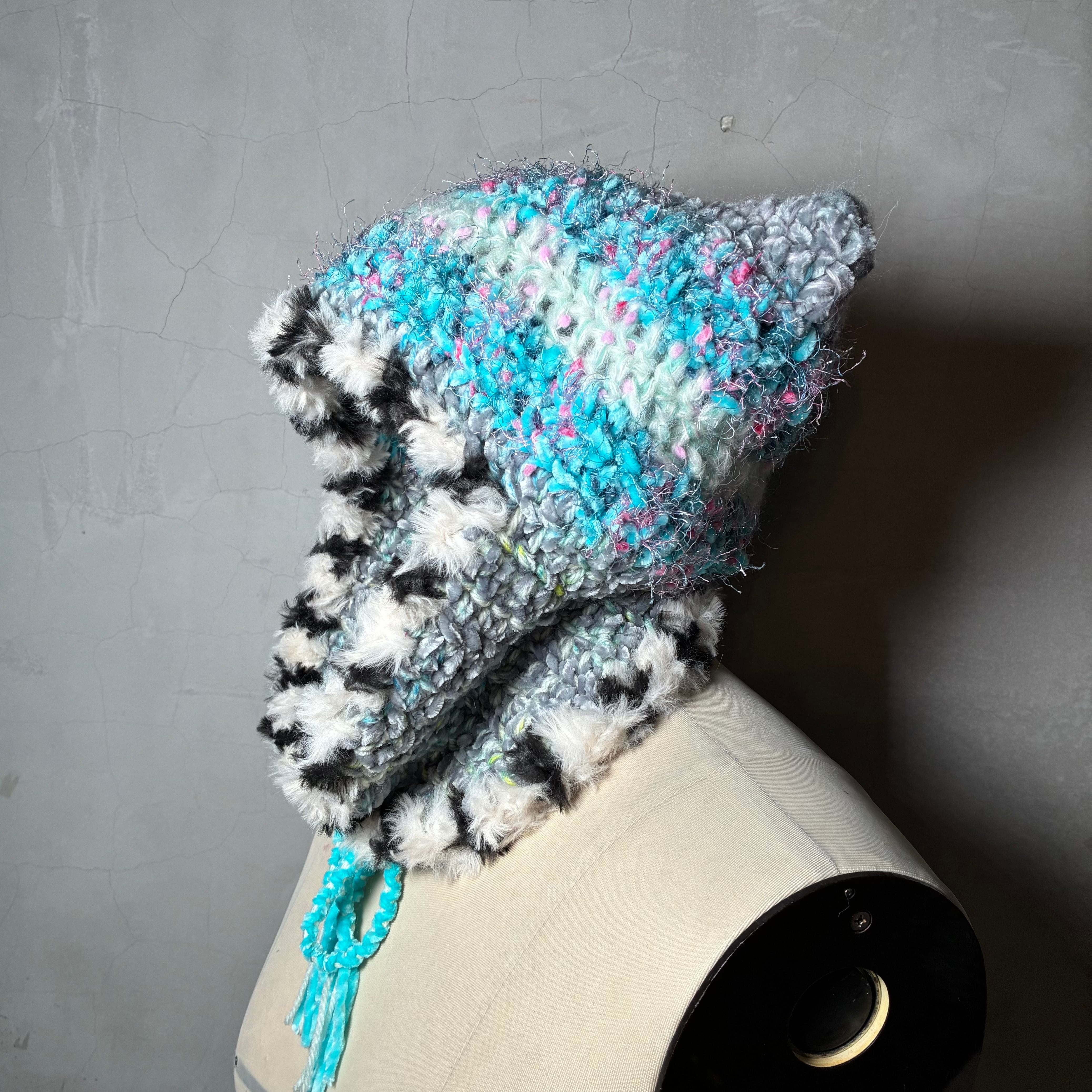 色んな毛糸をMIXして耳当てつきの猫耳ニットキャップを編みました。