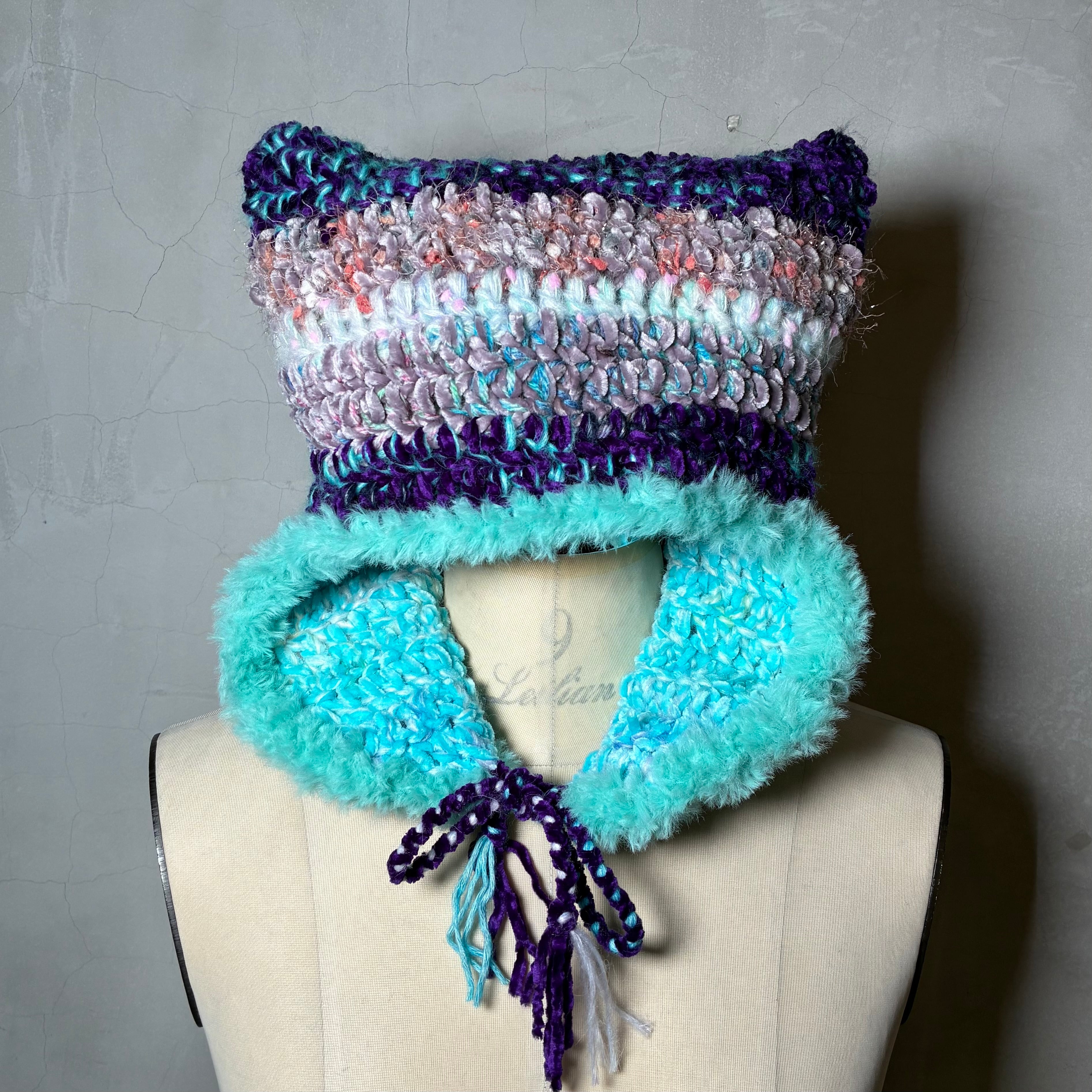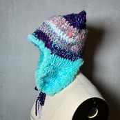 色んな毛糸をMIXして耳当てつきの猫耳ニットキャップを編みました。