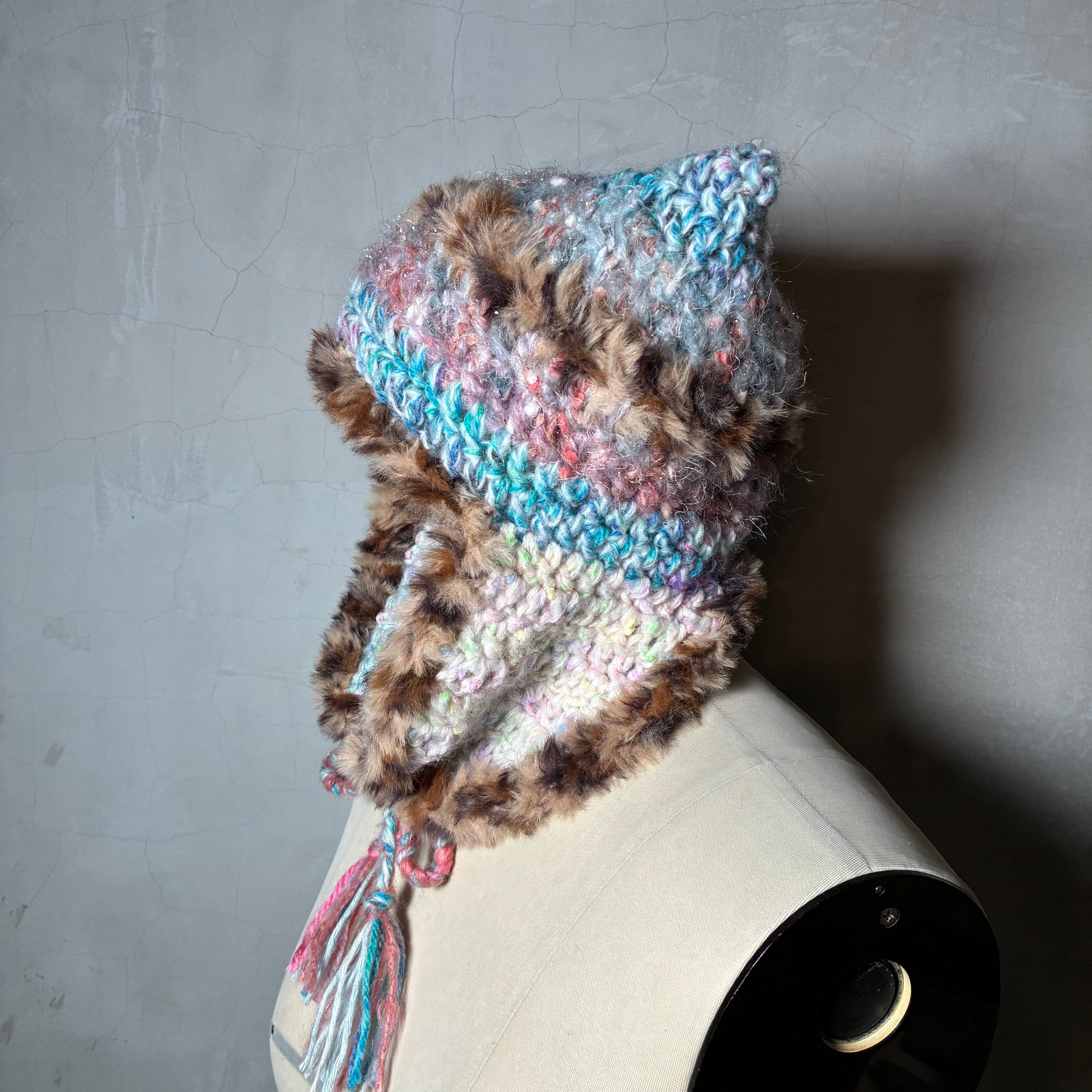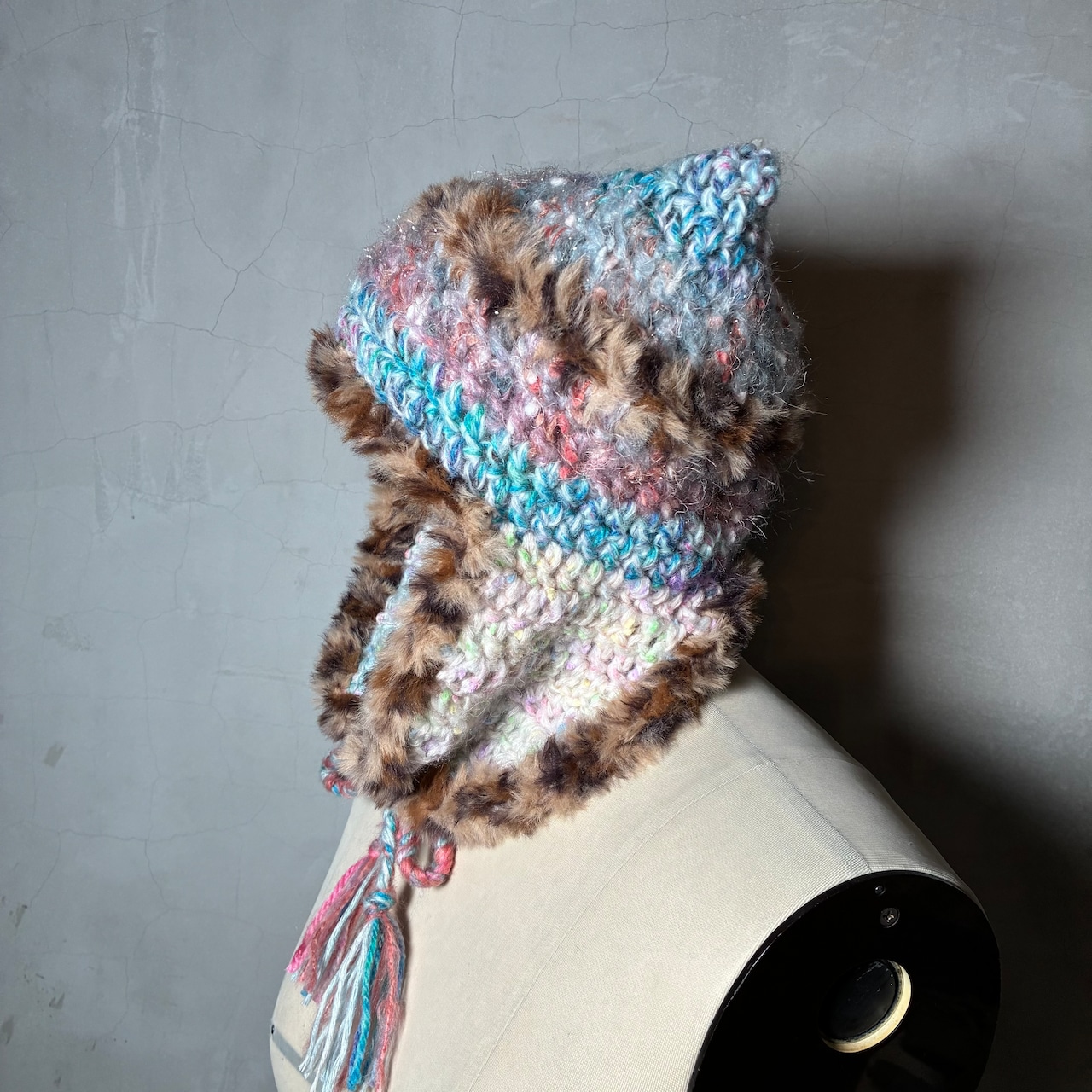 色んな毛糸をMIXして耳当てつきの猫耳ニットキャップを編みました。