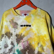 多色でカラフルに手染めしたボディにシルクスクリーンプリント、刺繍を施したトレーナー。