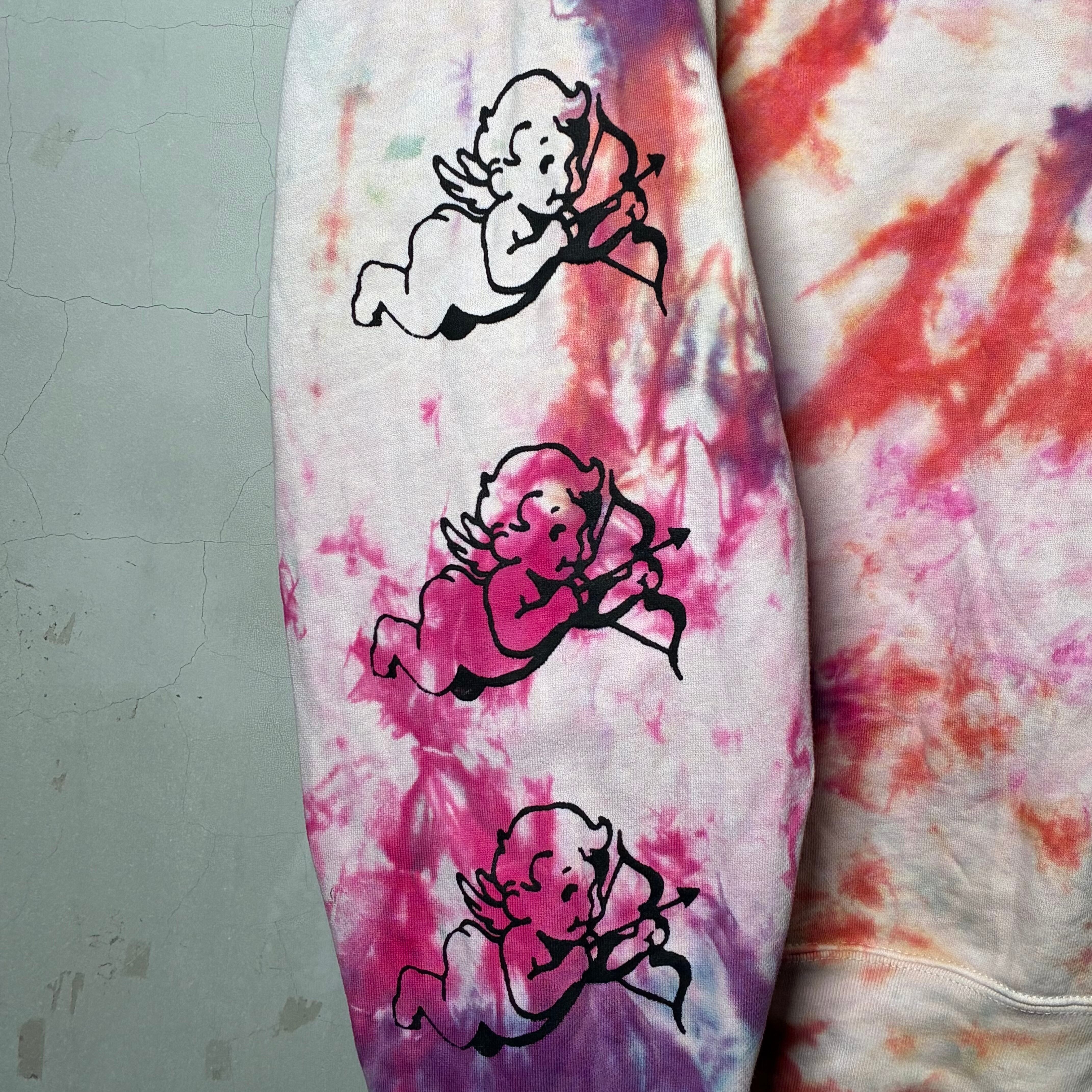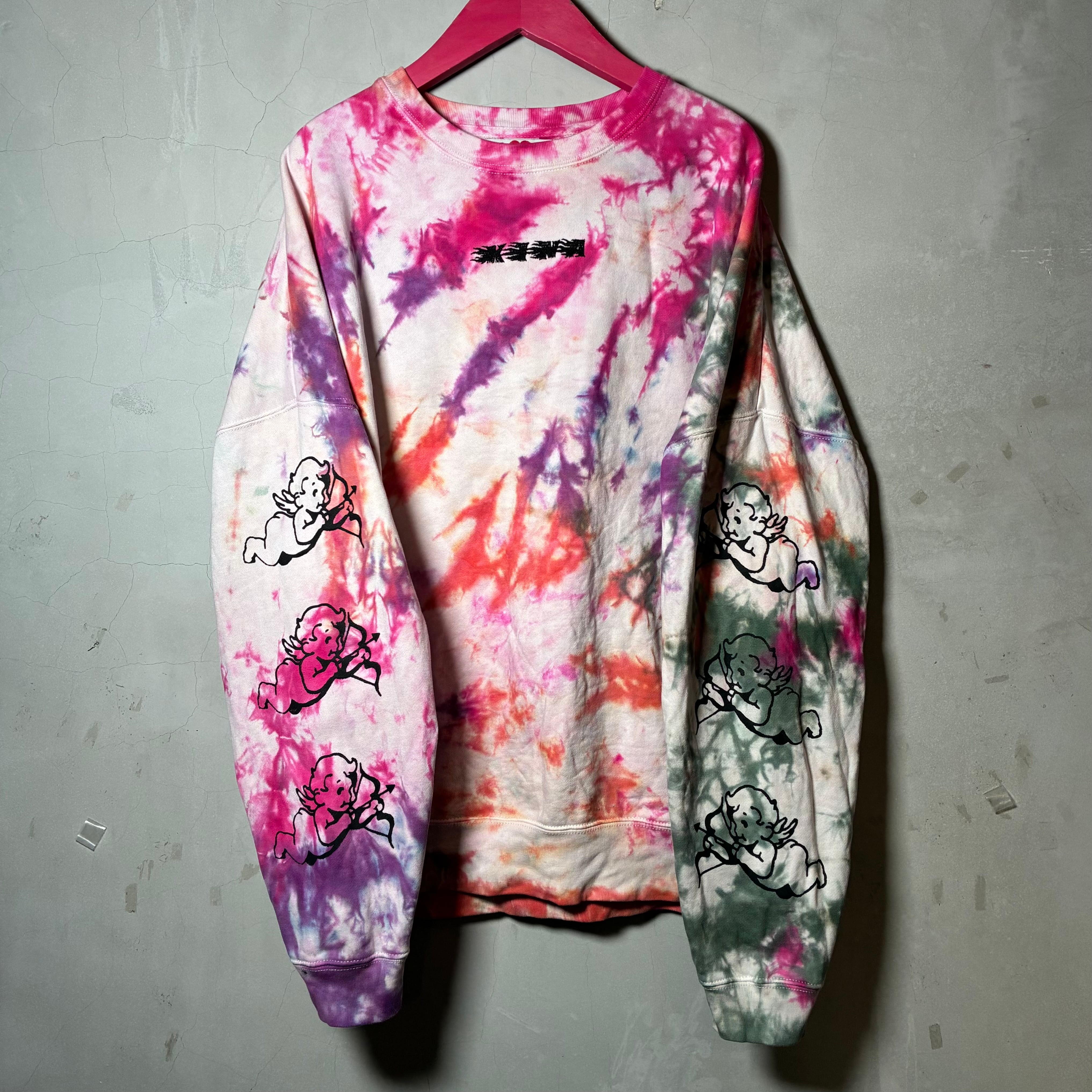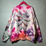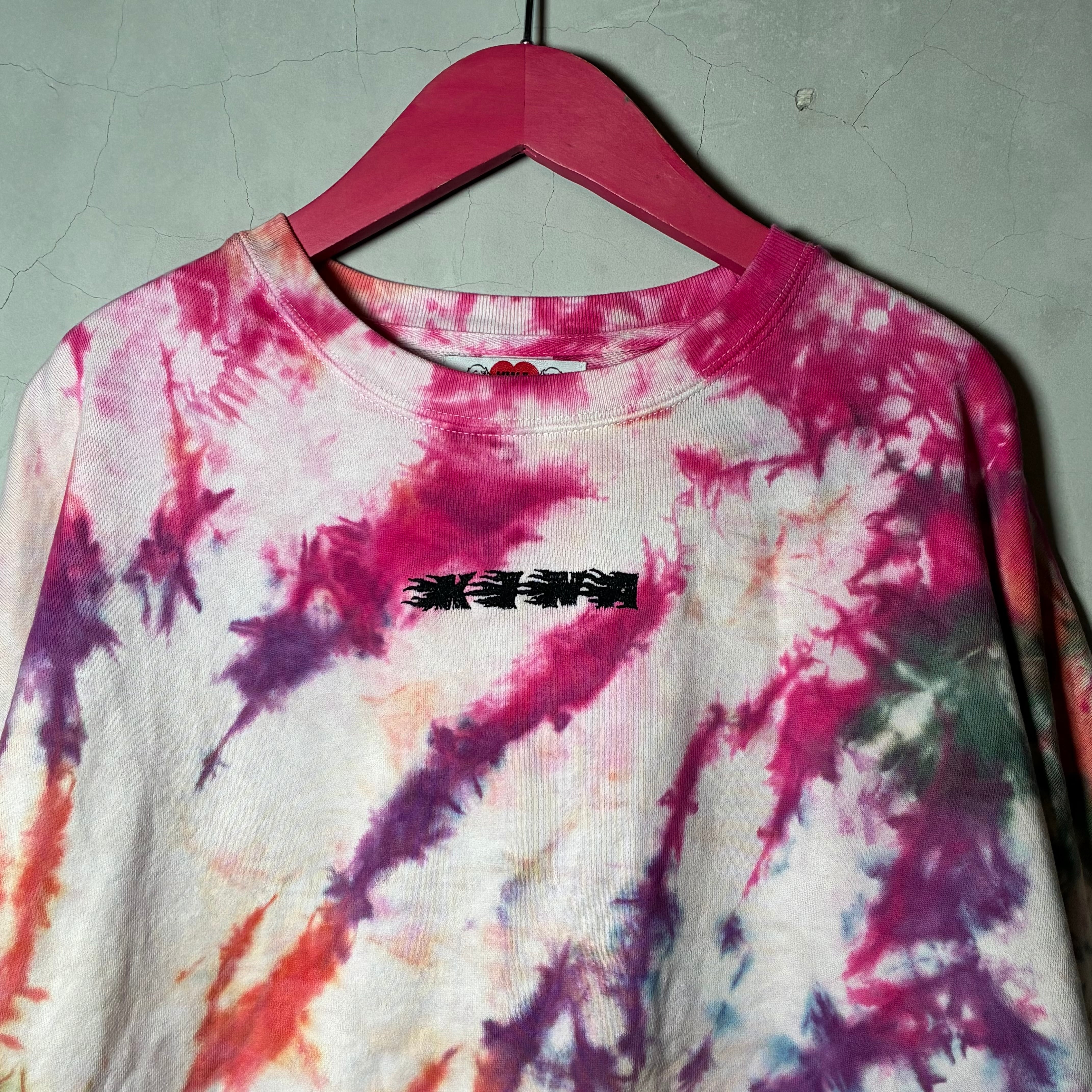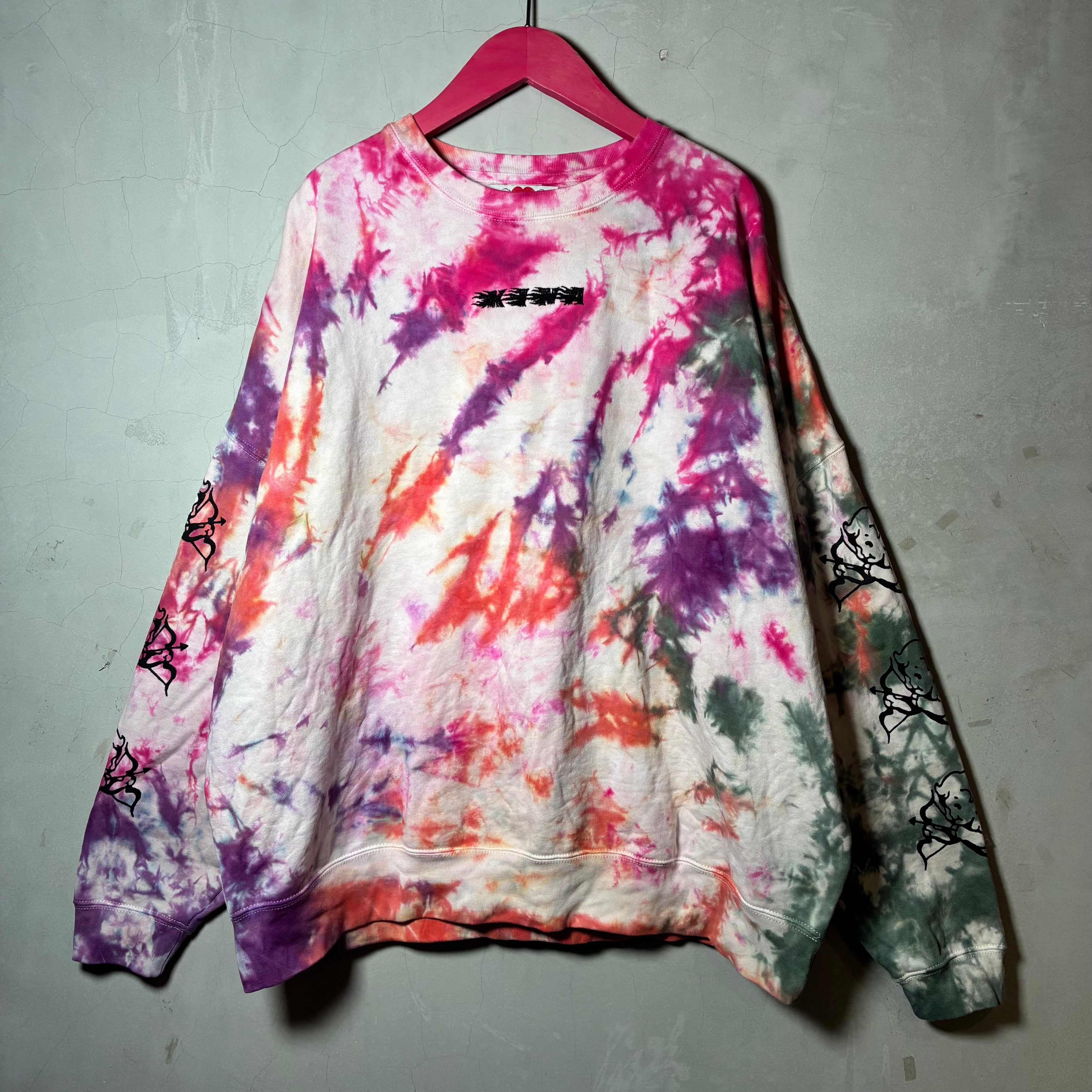 多色でカラフルに絞り染めしたボディにシルクスクリーンプリント、刺繍を施したトレーナー。