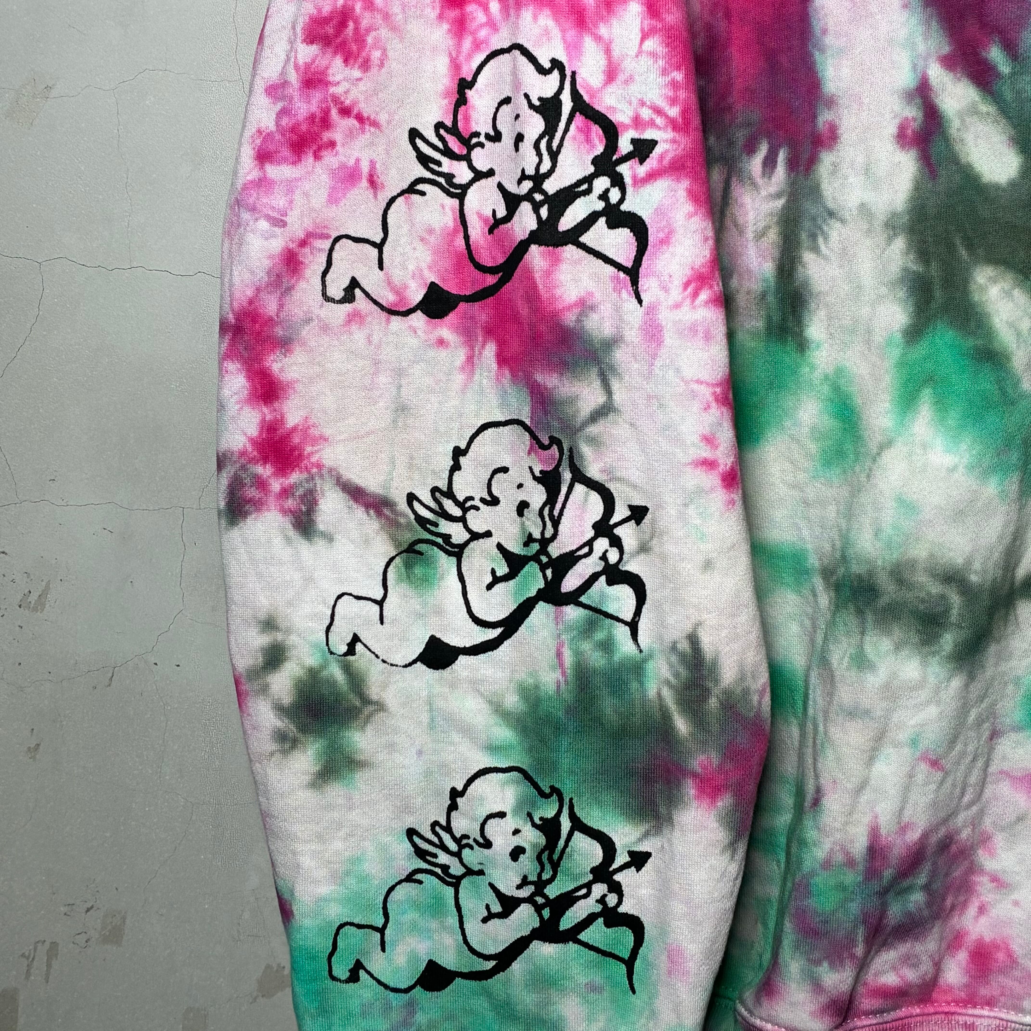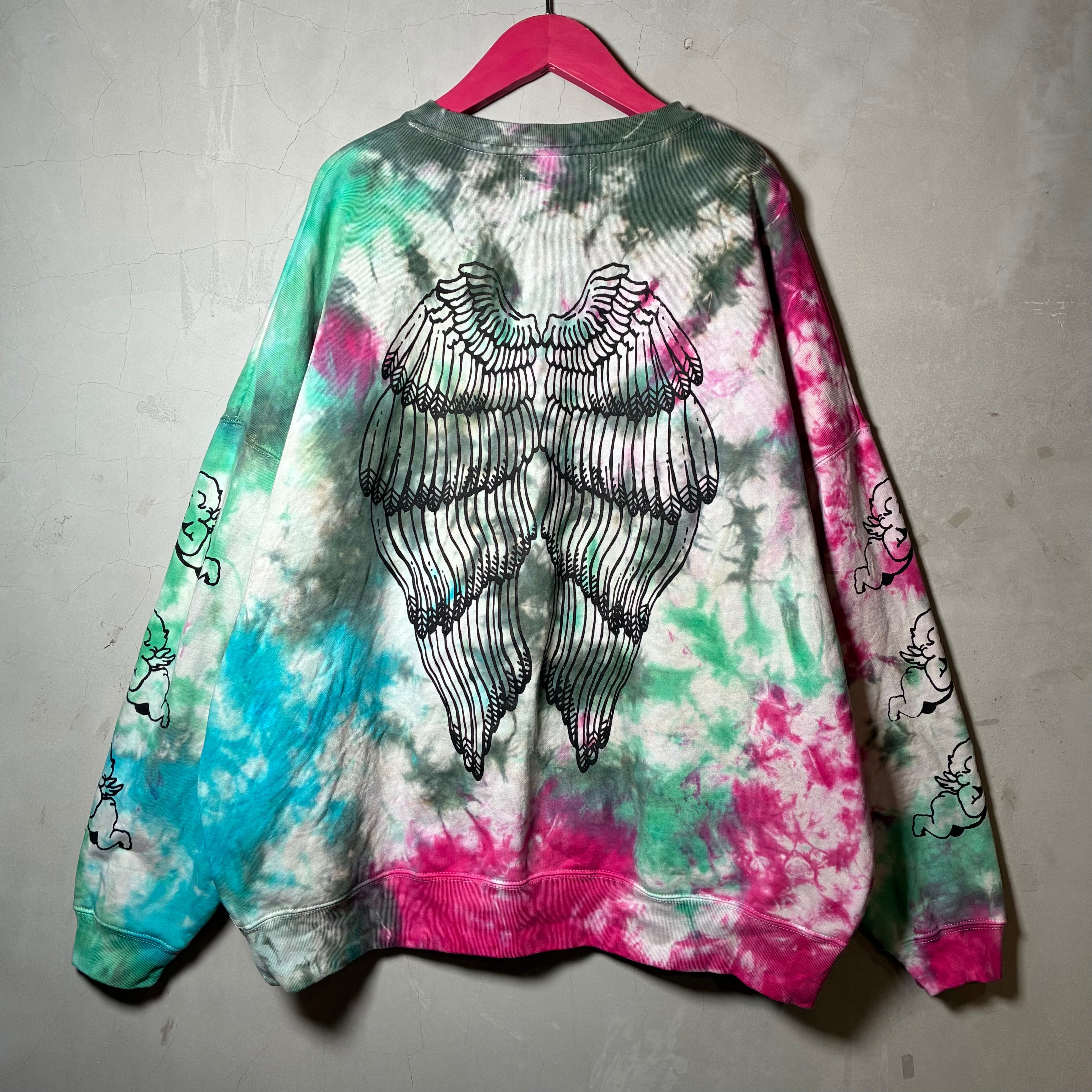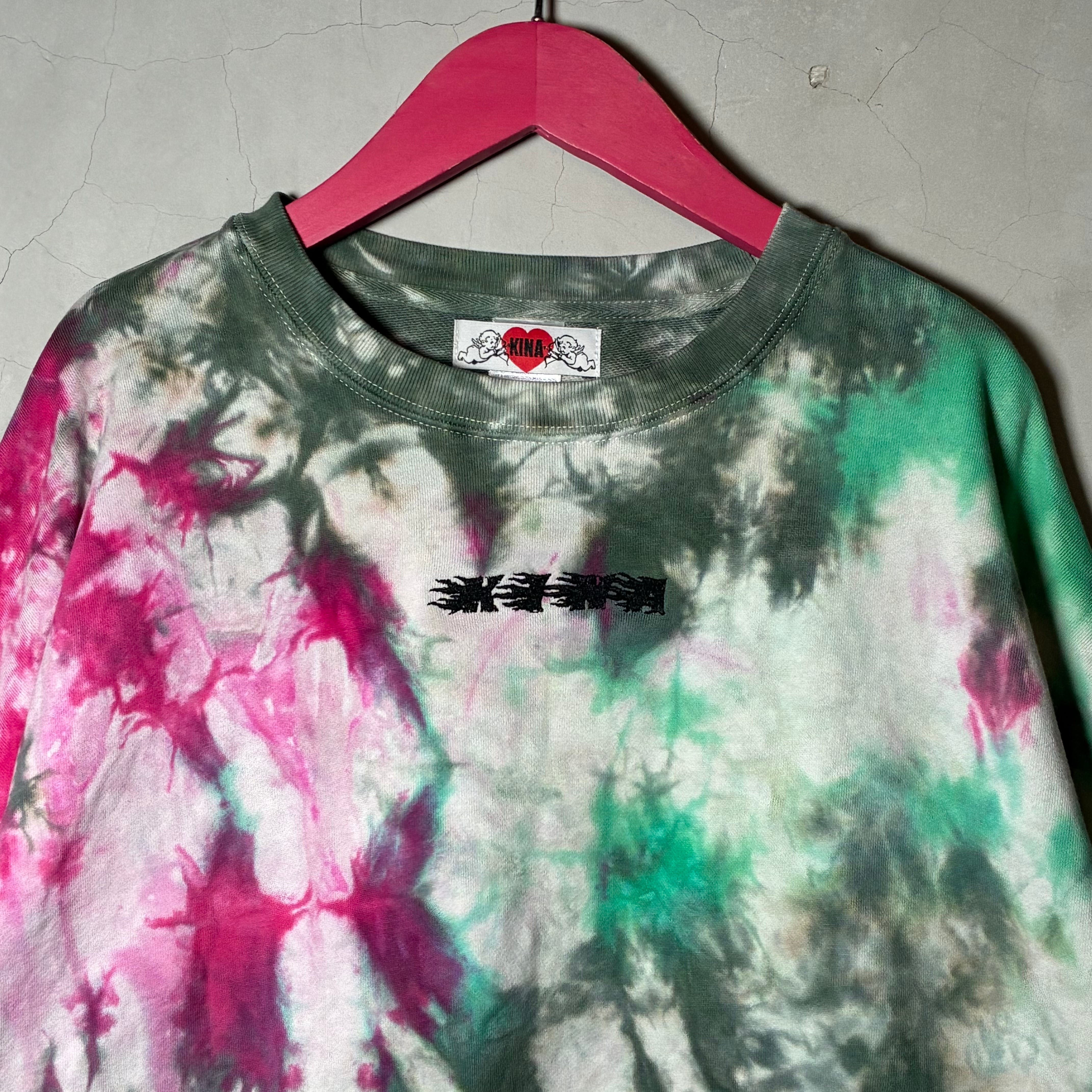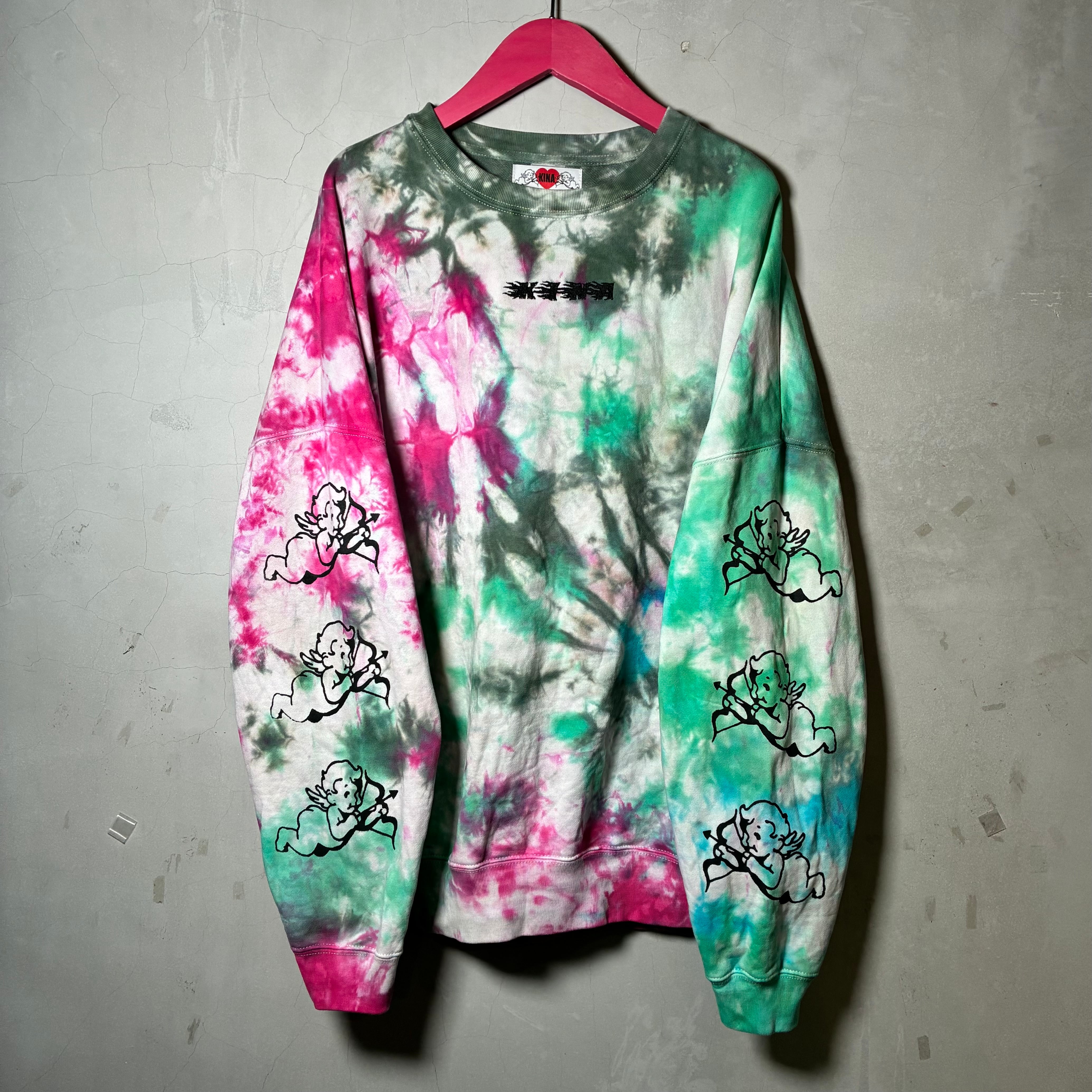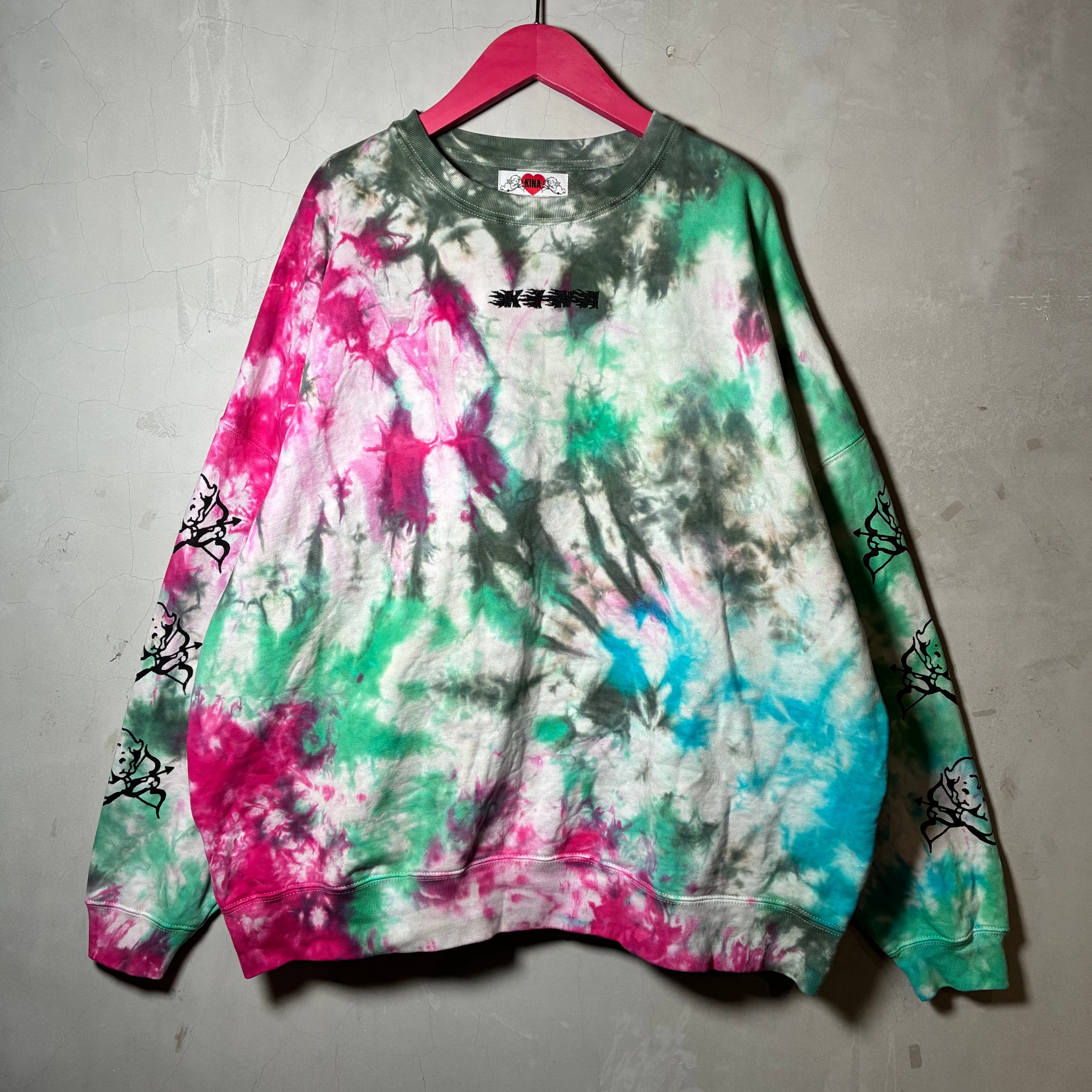 多色でカラフルに絞り染めしたボディにシルクスクリーンプリント、刺繍を施したトレーナー。