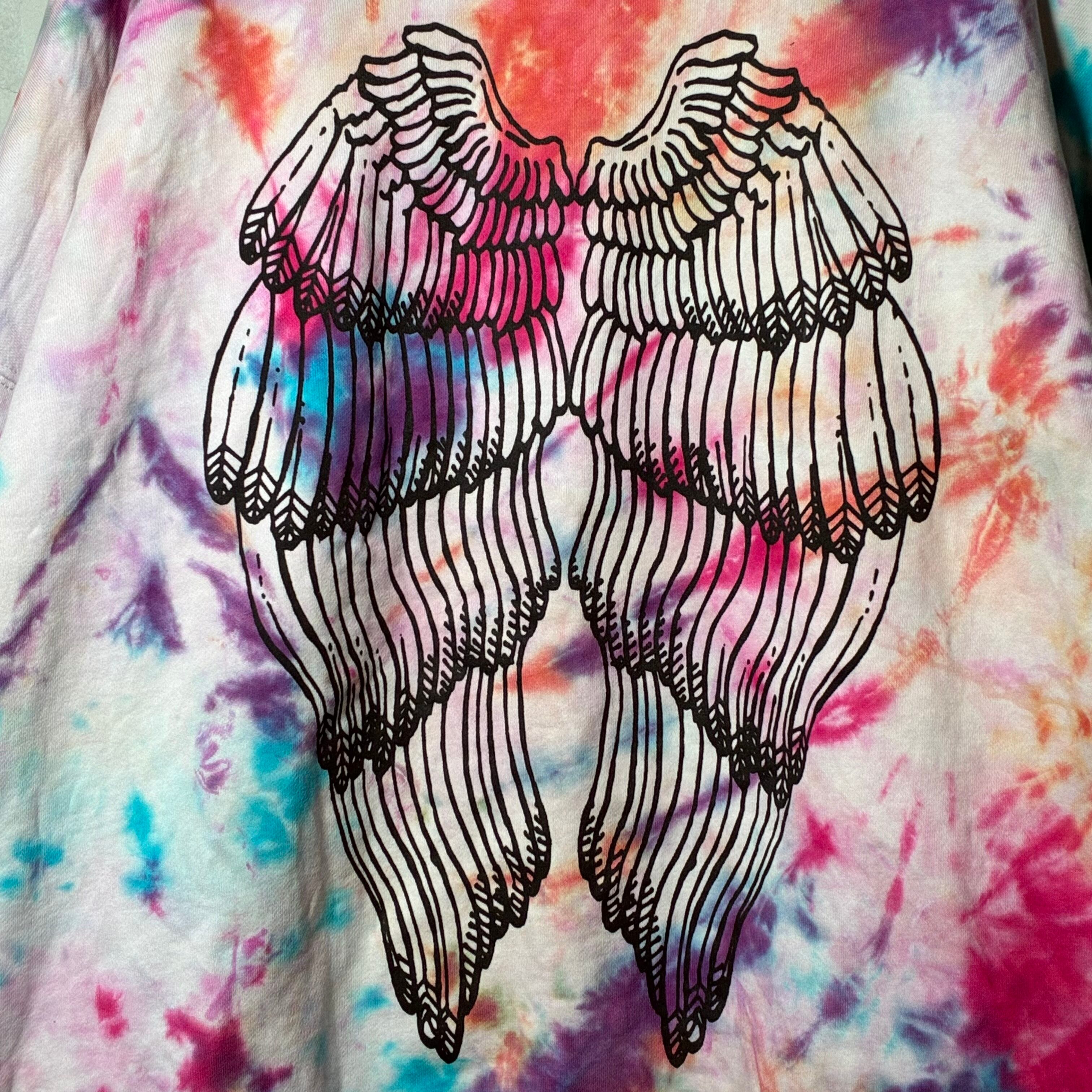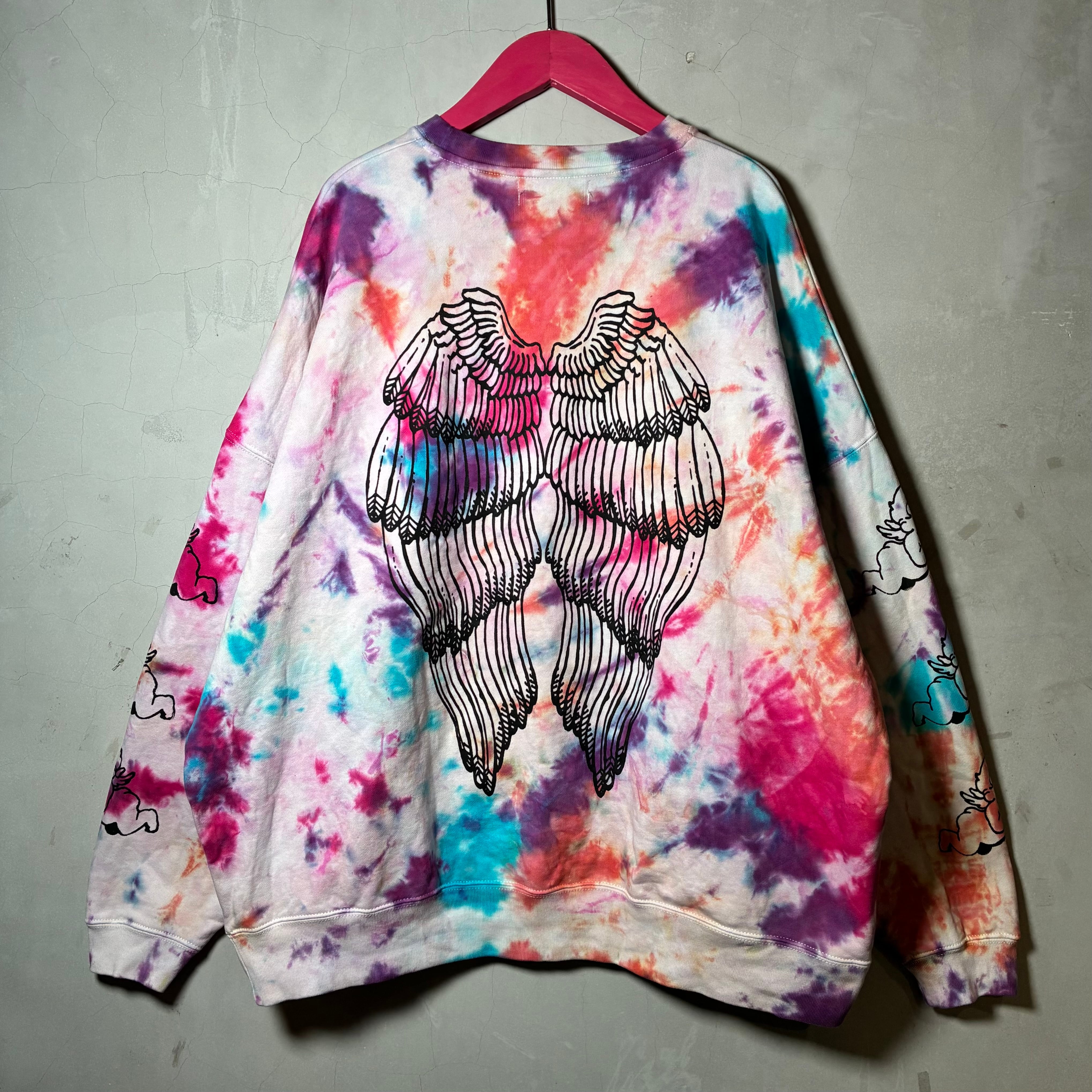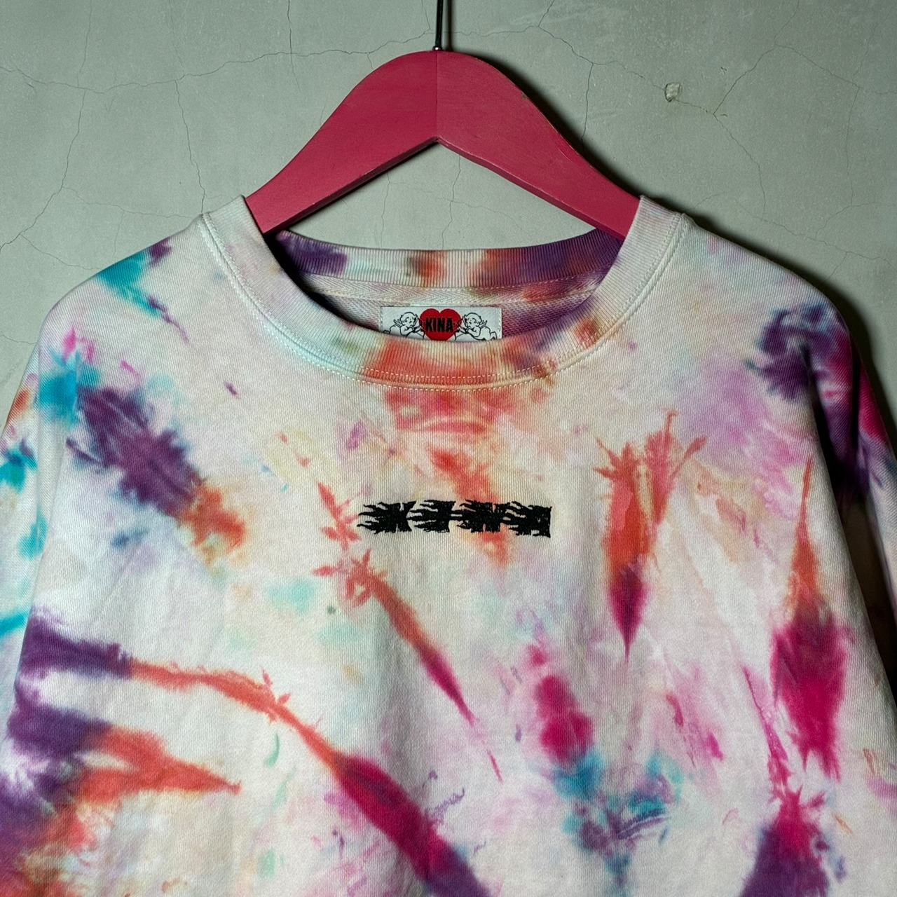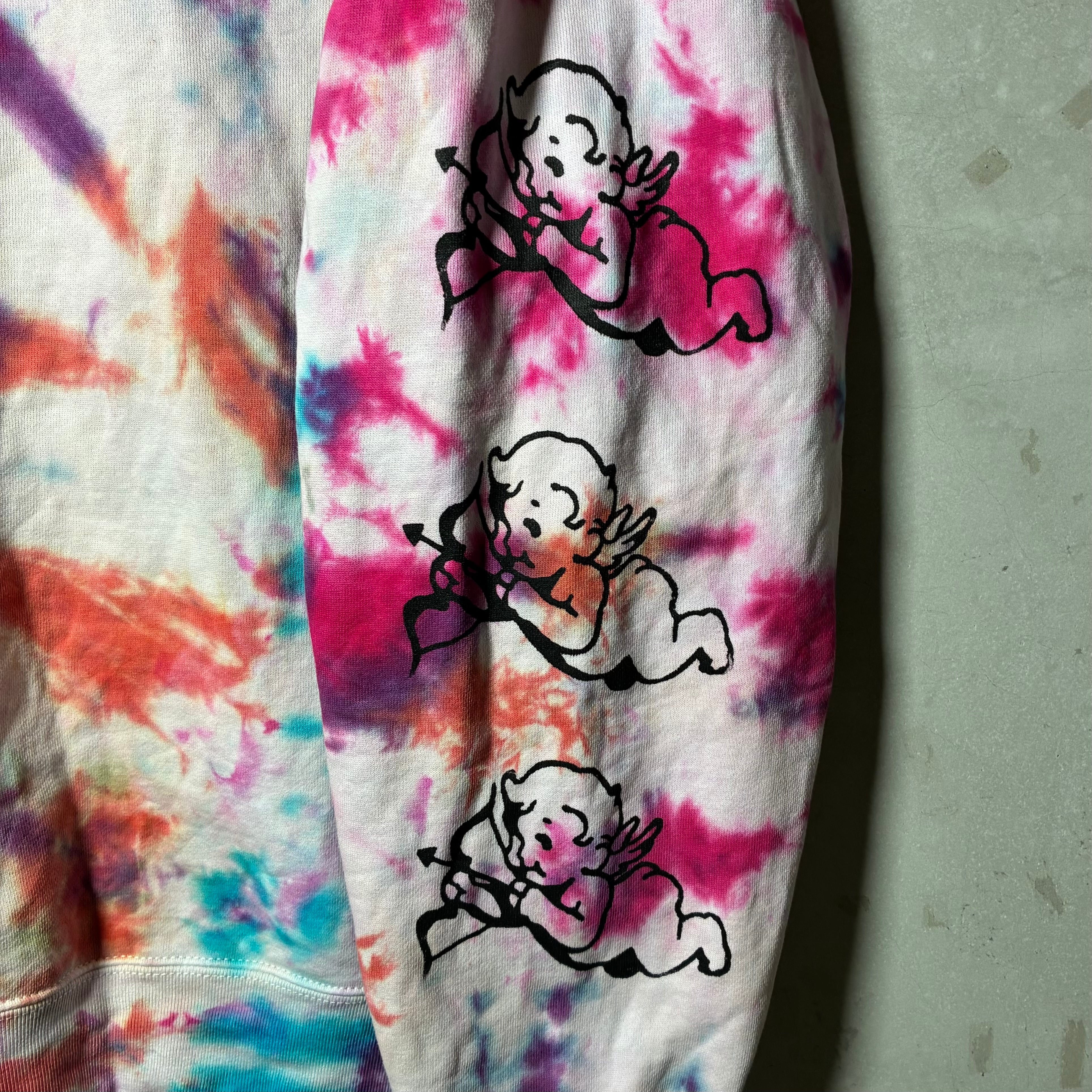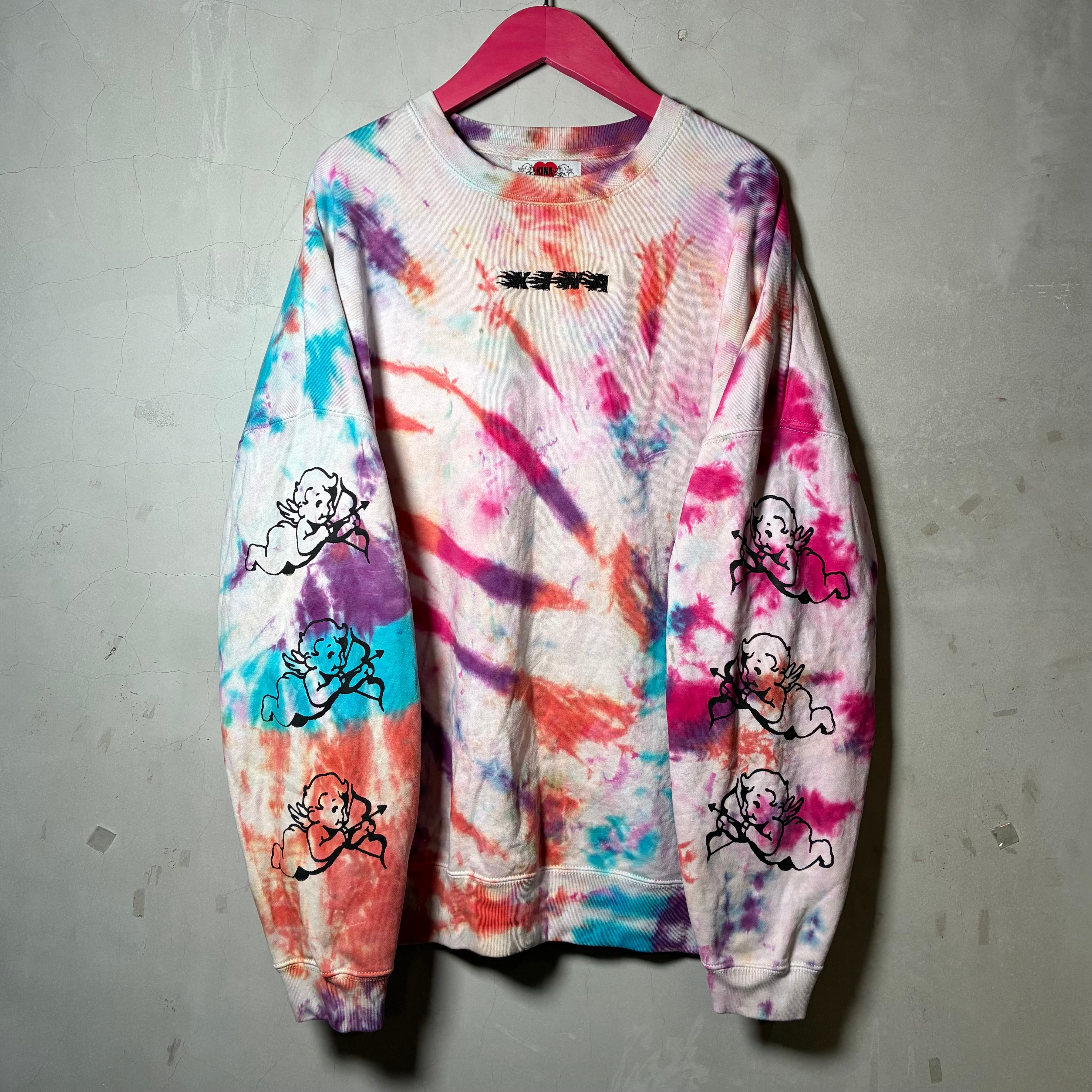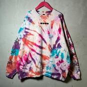 多色でカラフルに絞り染めしたボディにシルクスクリーンプリント、刺繍を施したトレーナー。