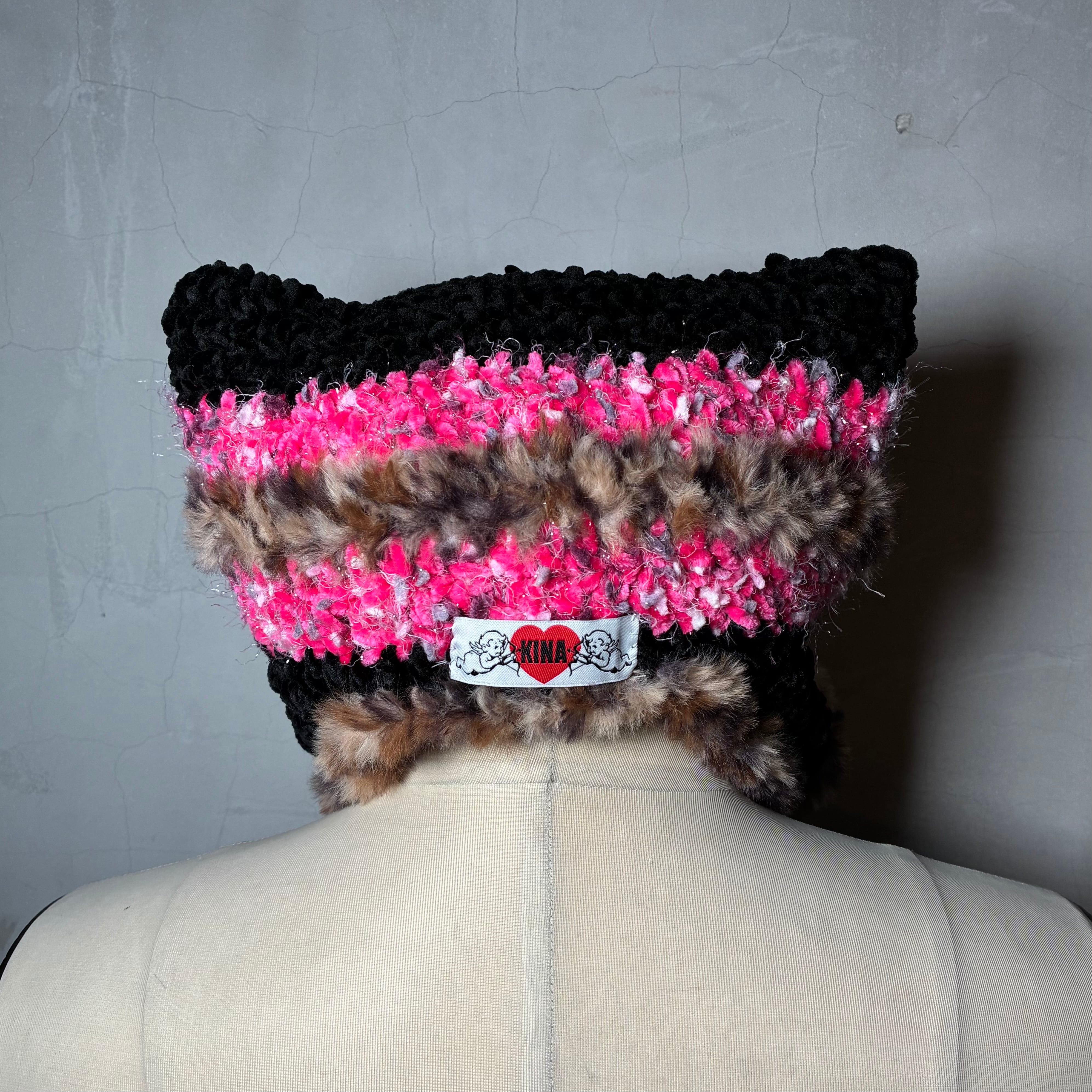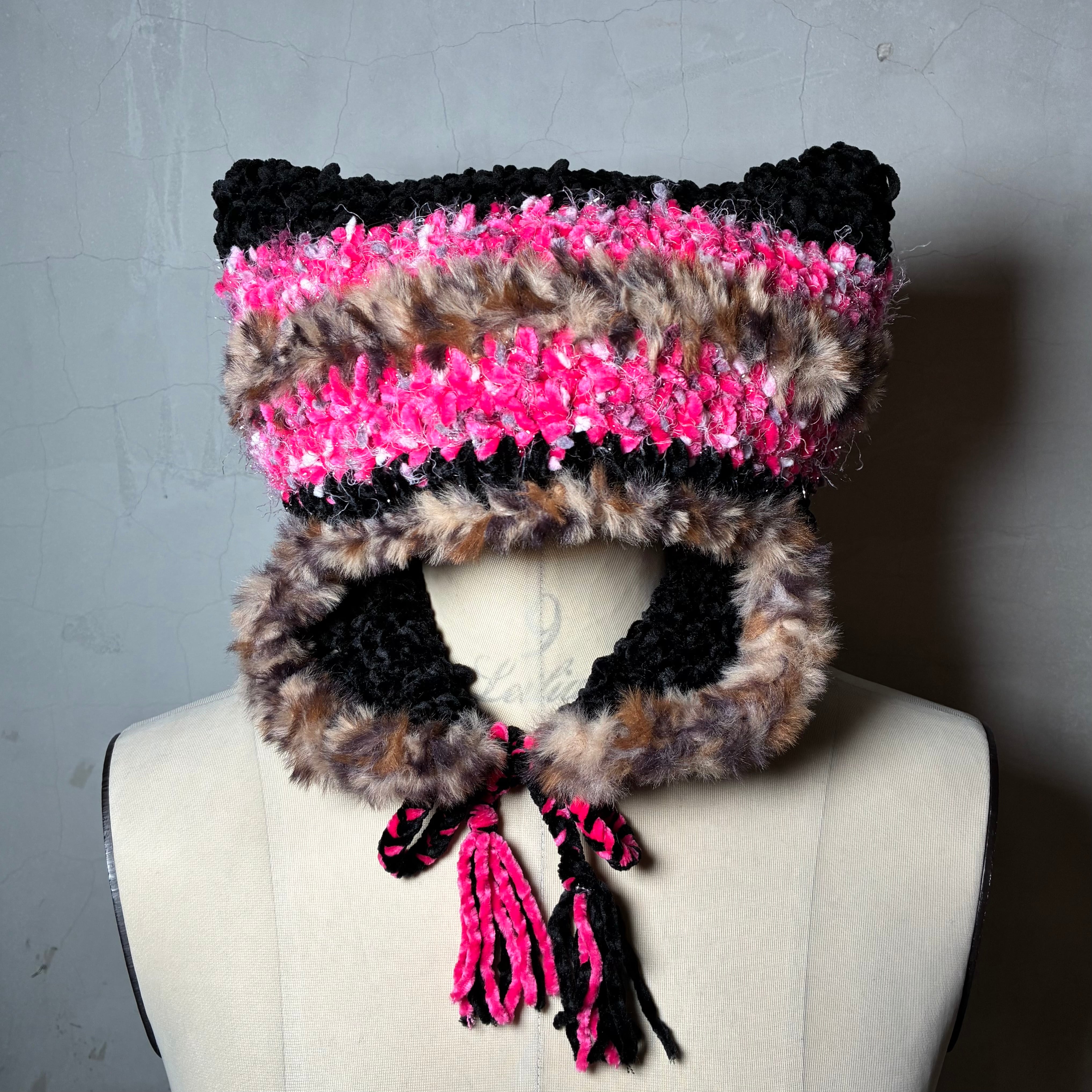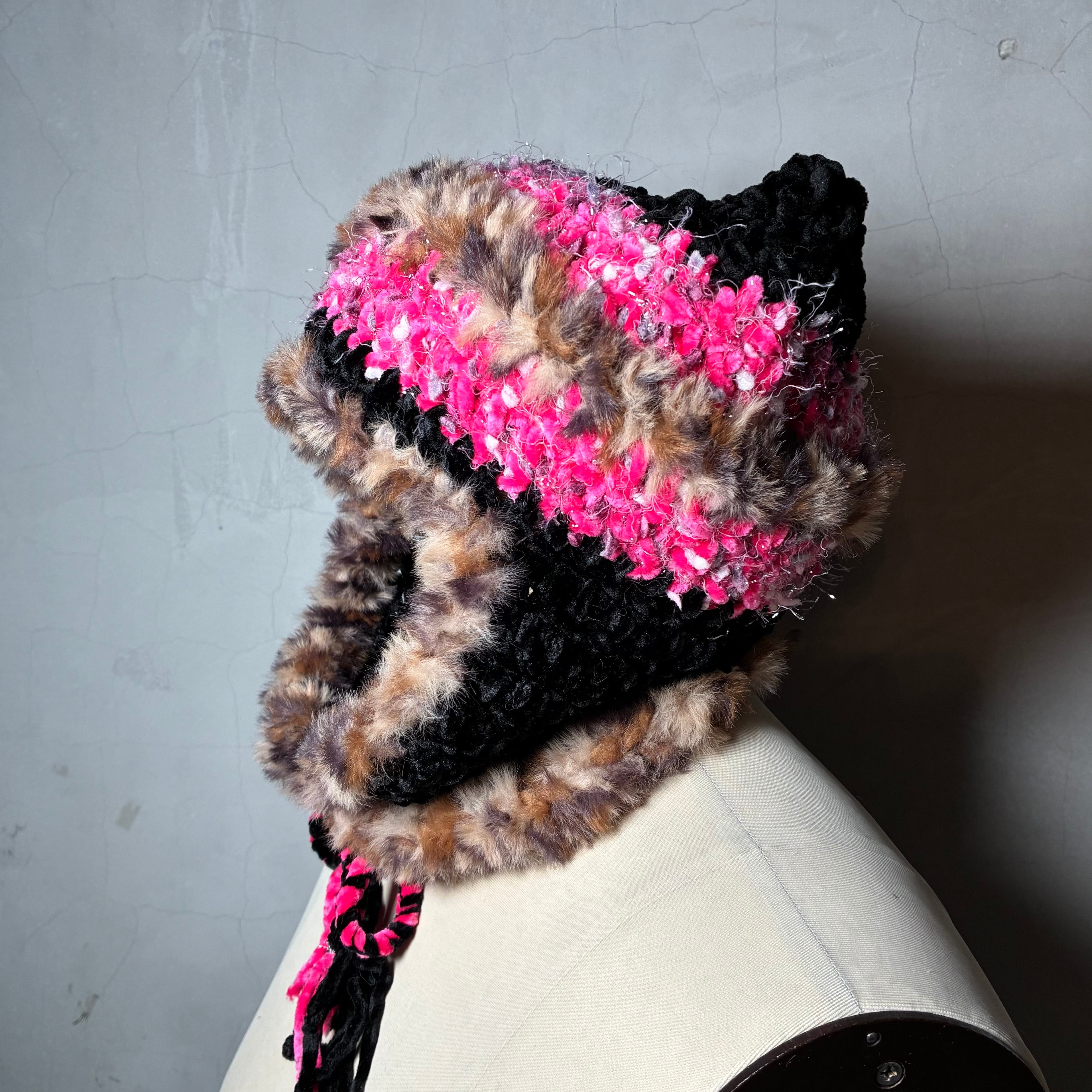 色んな毛糸をMIXして耳当てつきの猫耳ニットキャップを編みました。