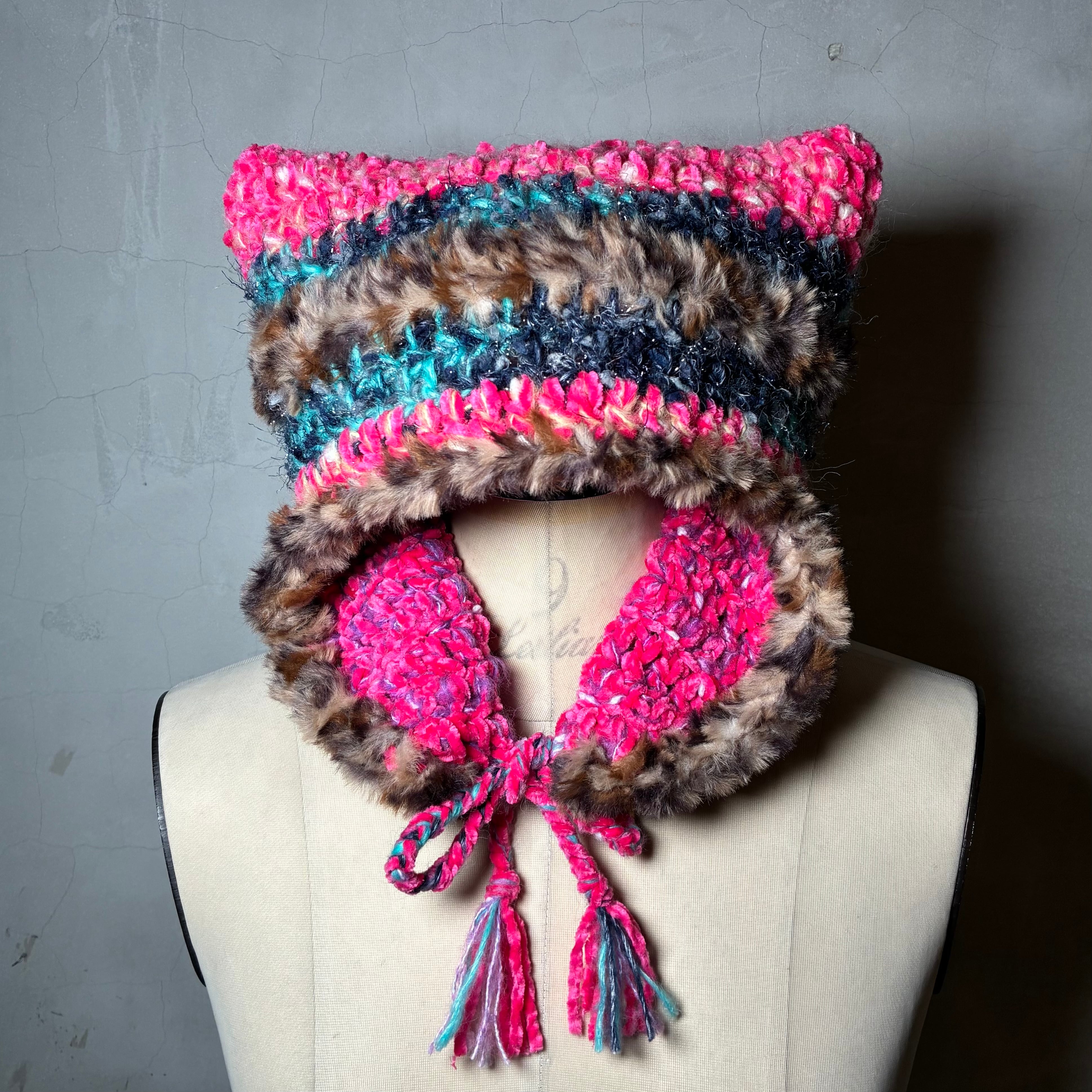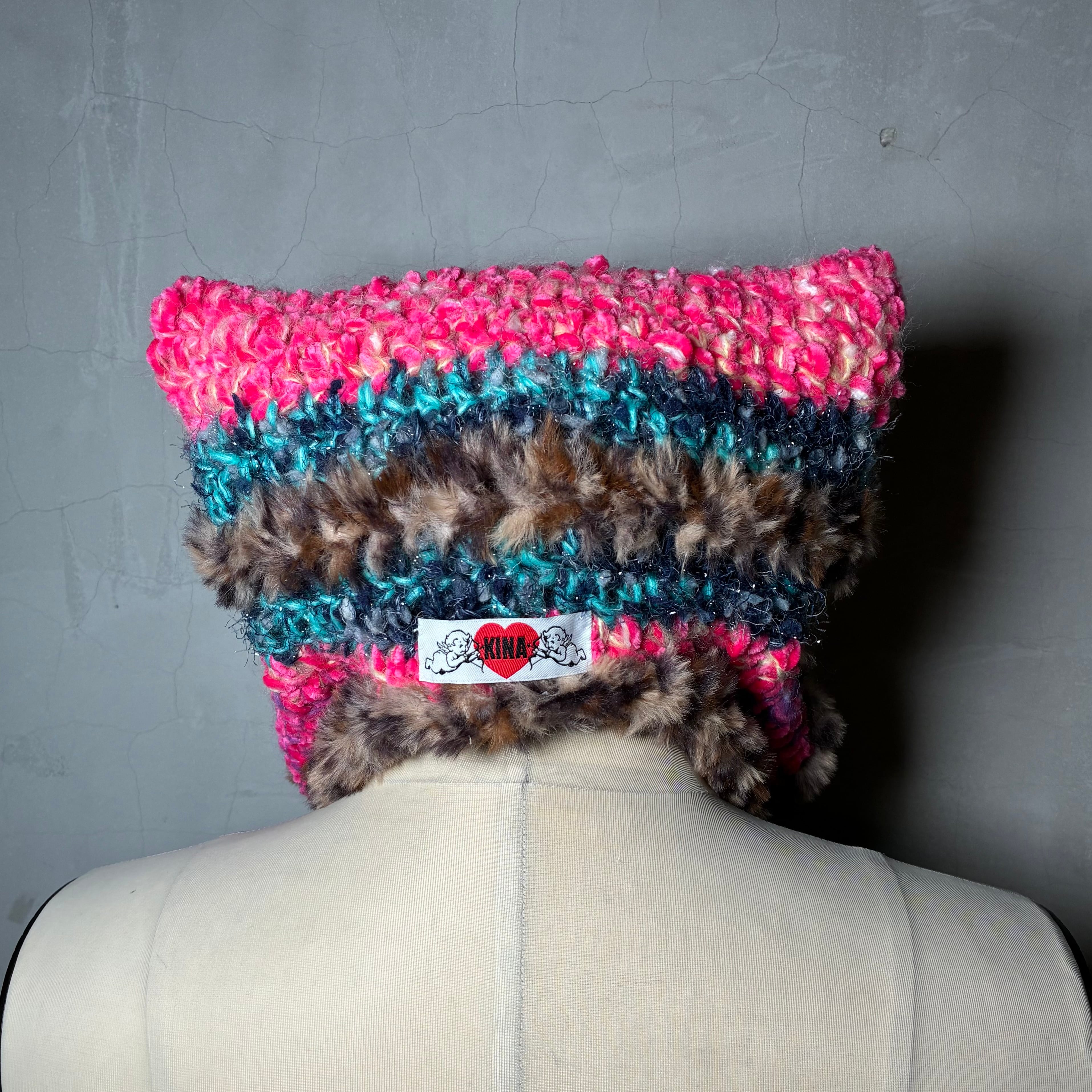 色んな毛糸をMIXして耳当てつきの猫耳ニットキャップを編みました。