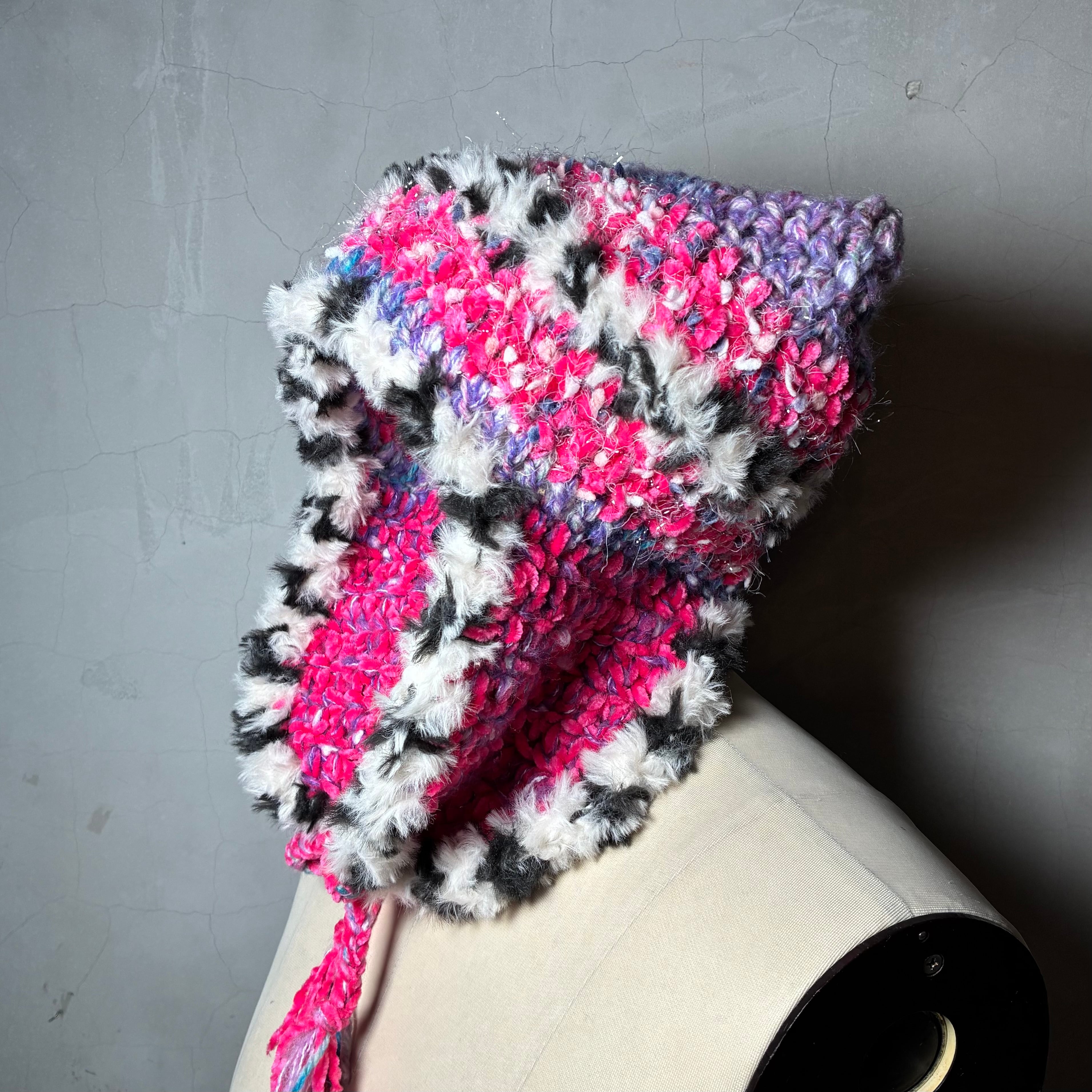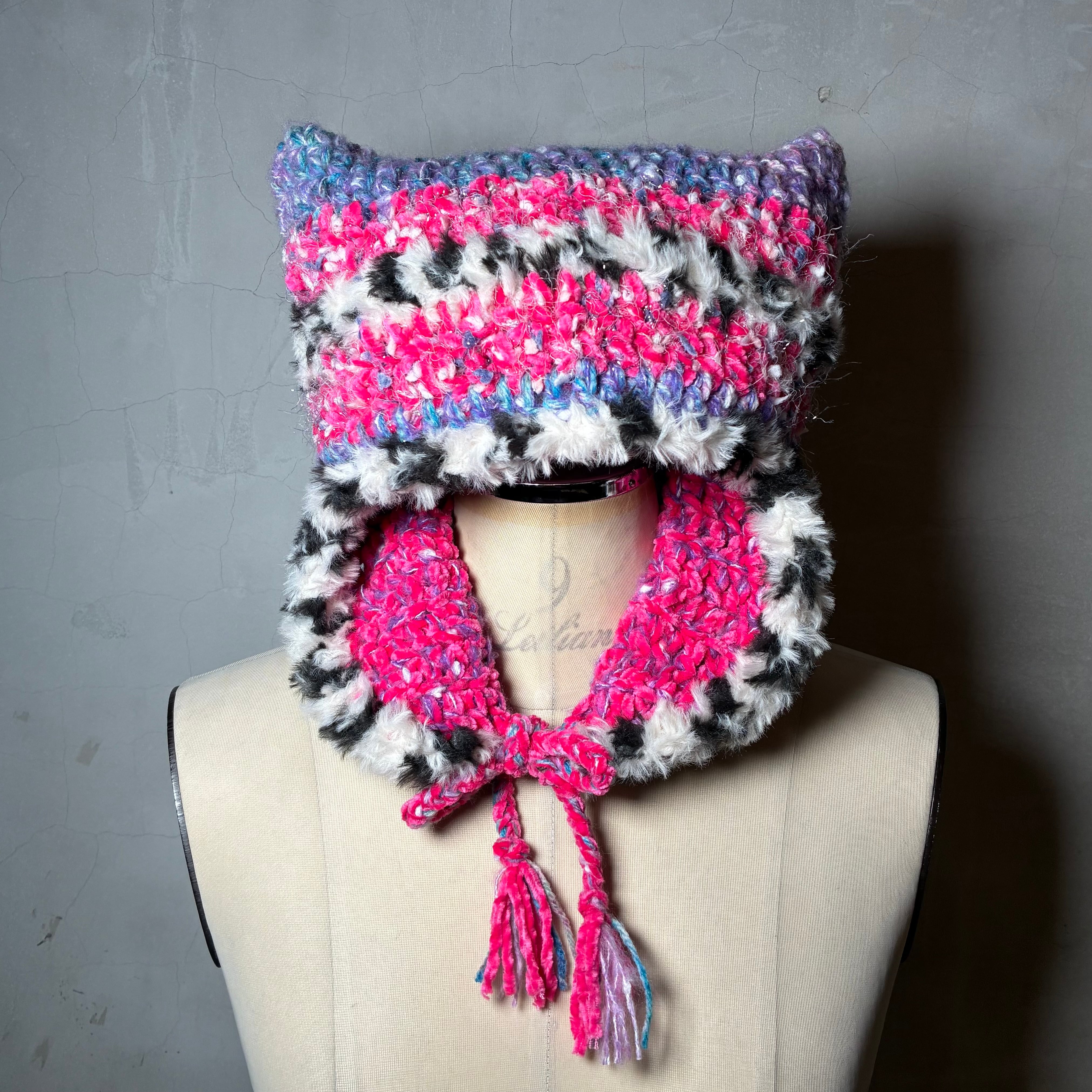 色んな毛糸をMIXして耳当てつきの猫耳ニットキャップを編みました。
