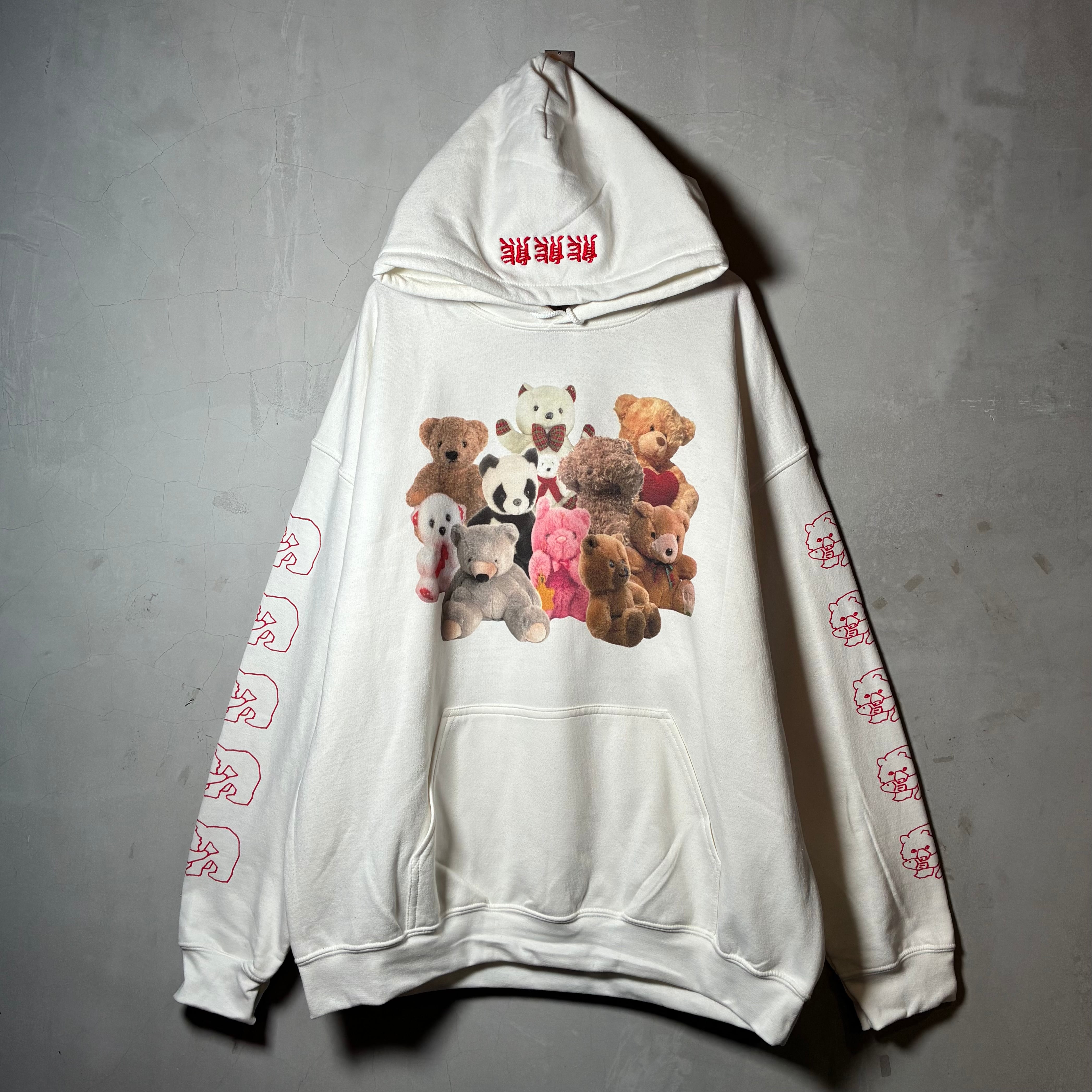 くまさんのぬいぐるみをぎゅっと集めたプリントのパーカー。