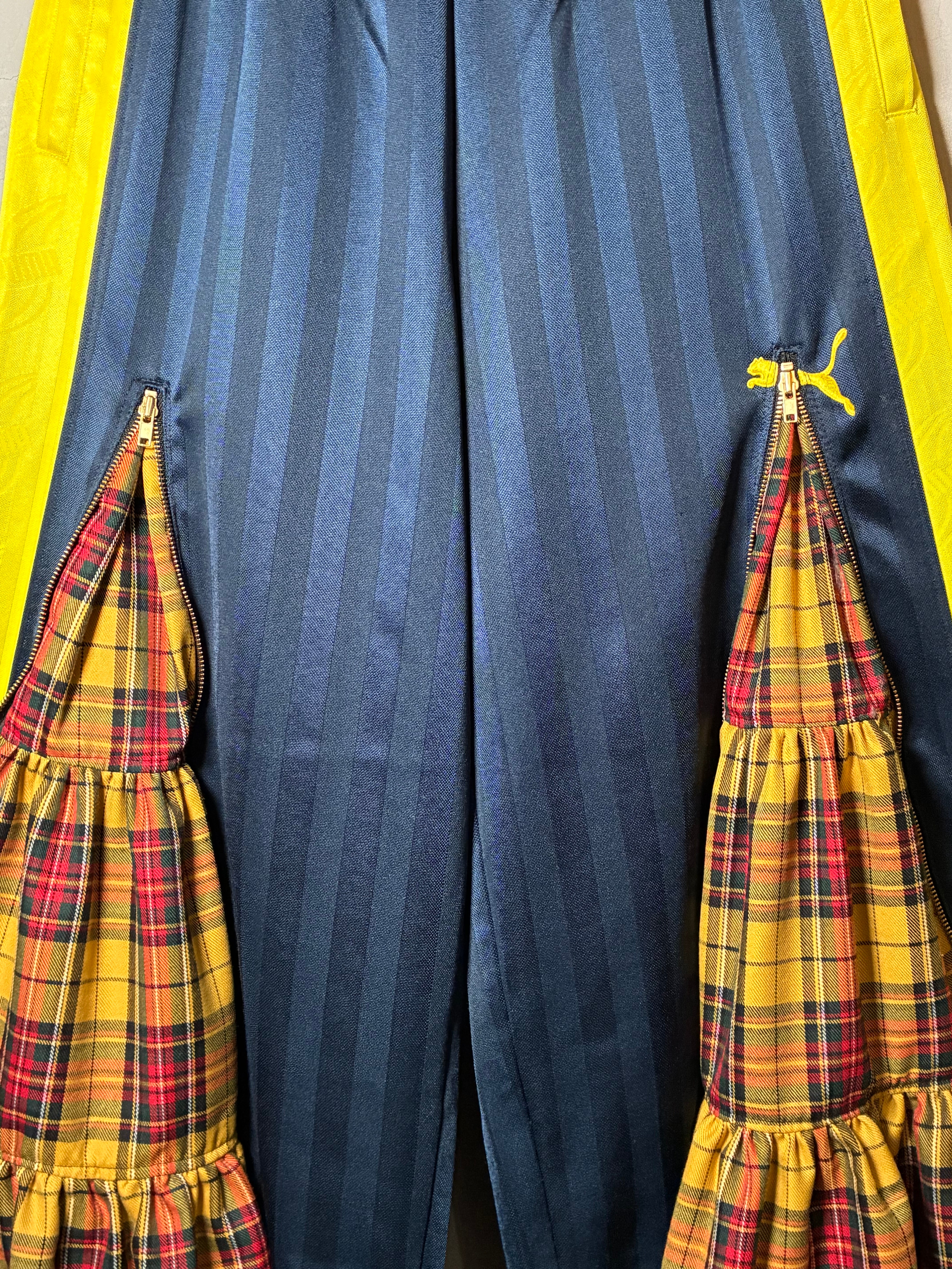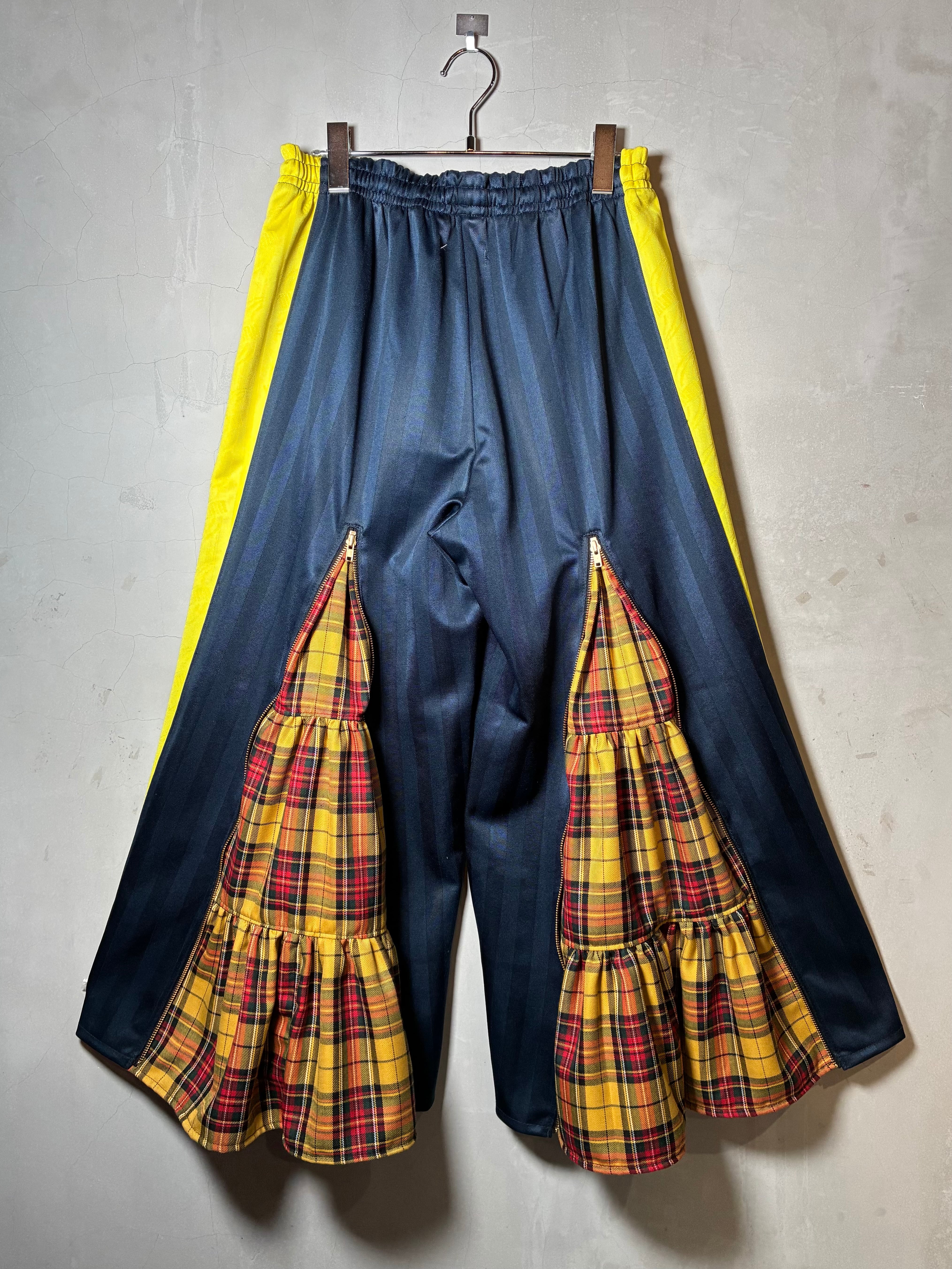 トラックパンツにファスナーをつけて前後の裾が広がるデザインに。