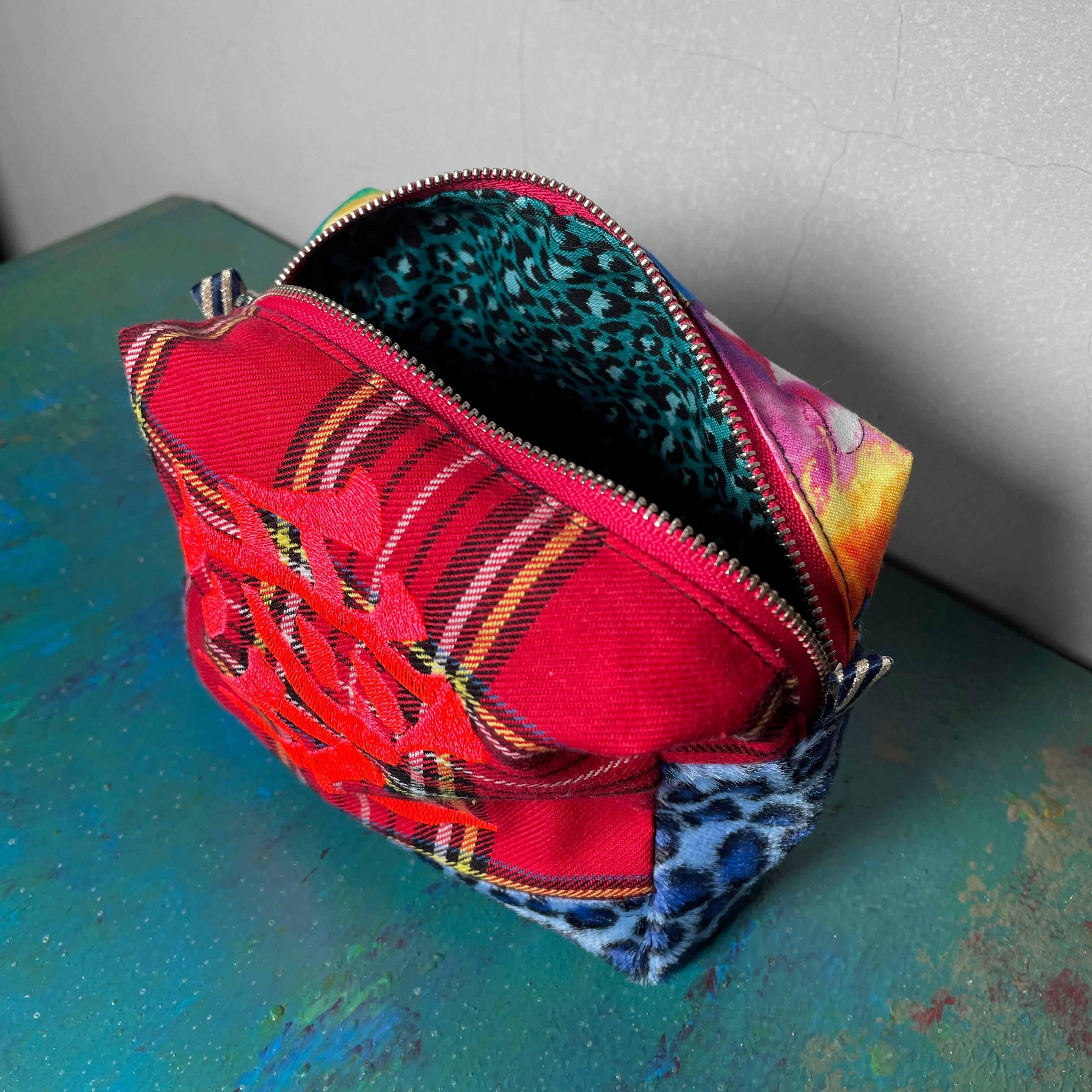 オリジナル刺繍したチェック柄に派手な柄、アニマル柄のファーを組み合わせました。