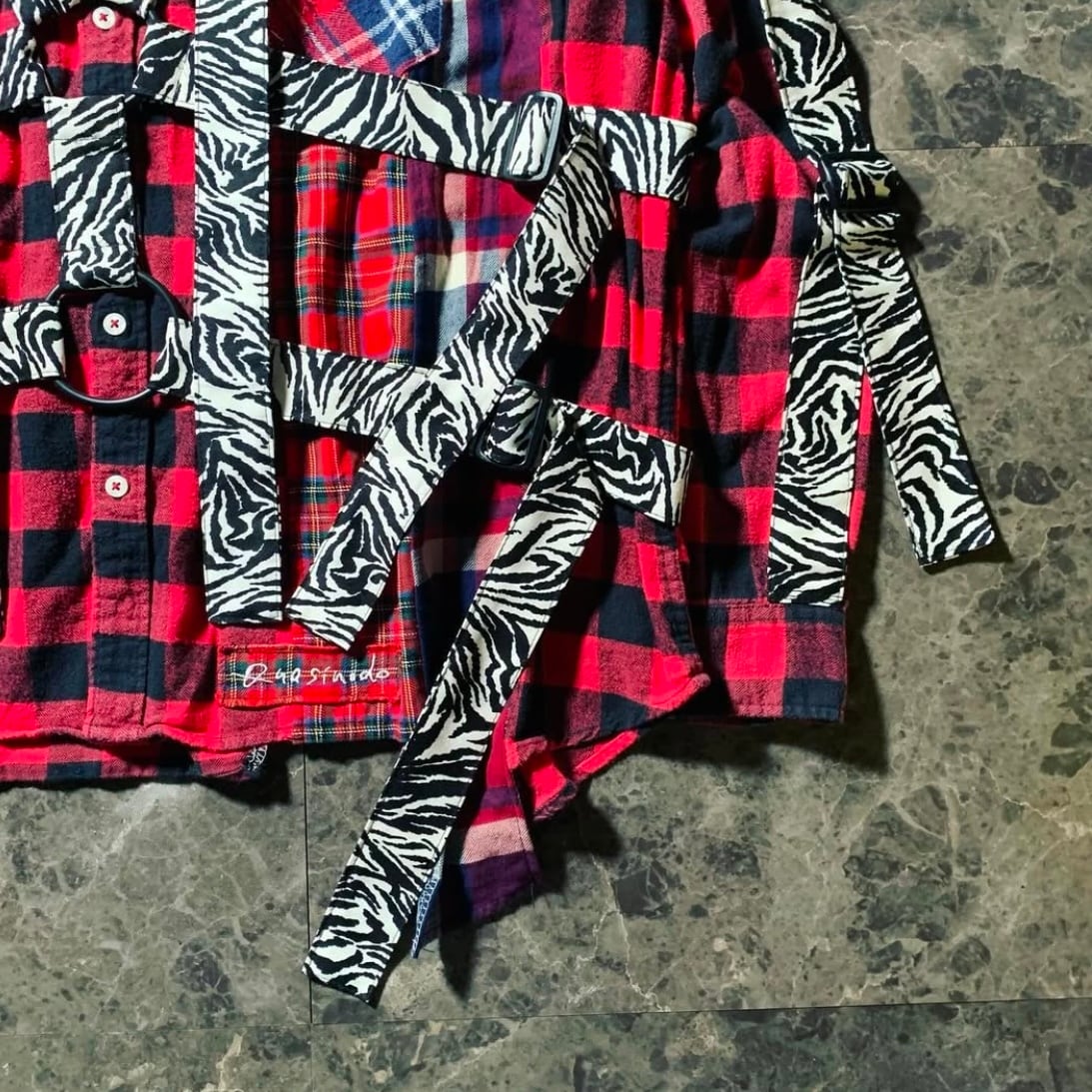 コチラは人気の赤チェックをMIXしたボディにゼブラ柄のストラップを。